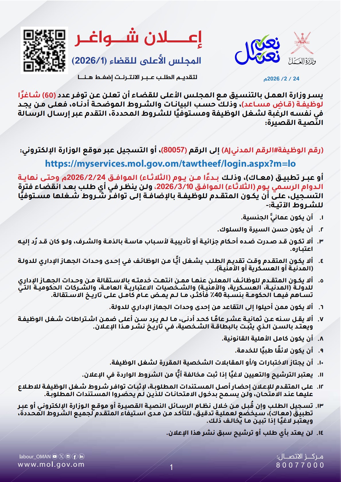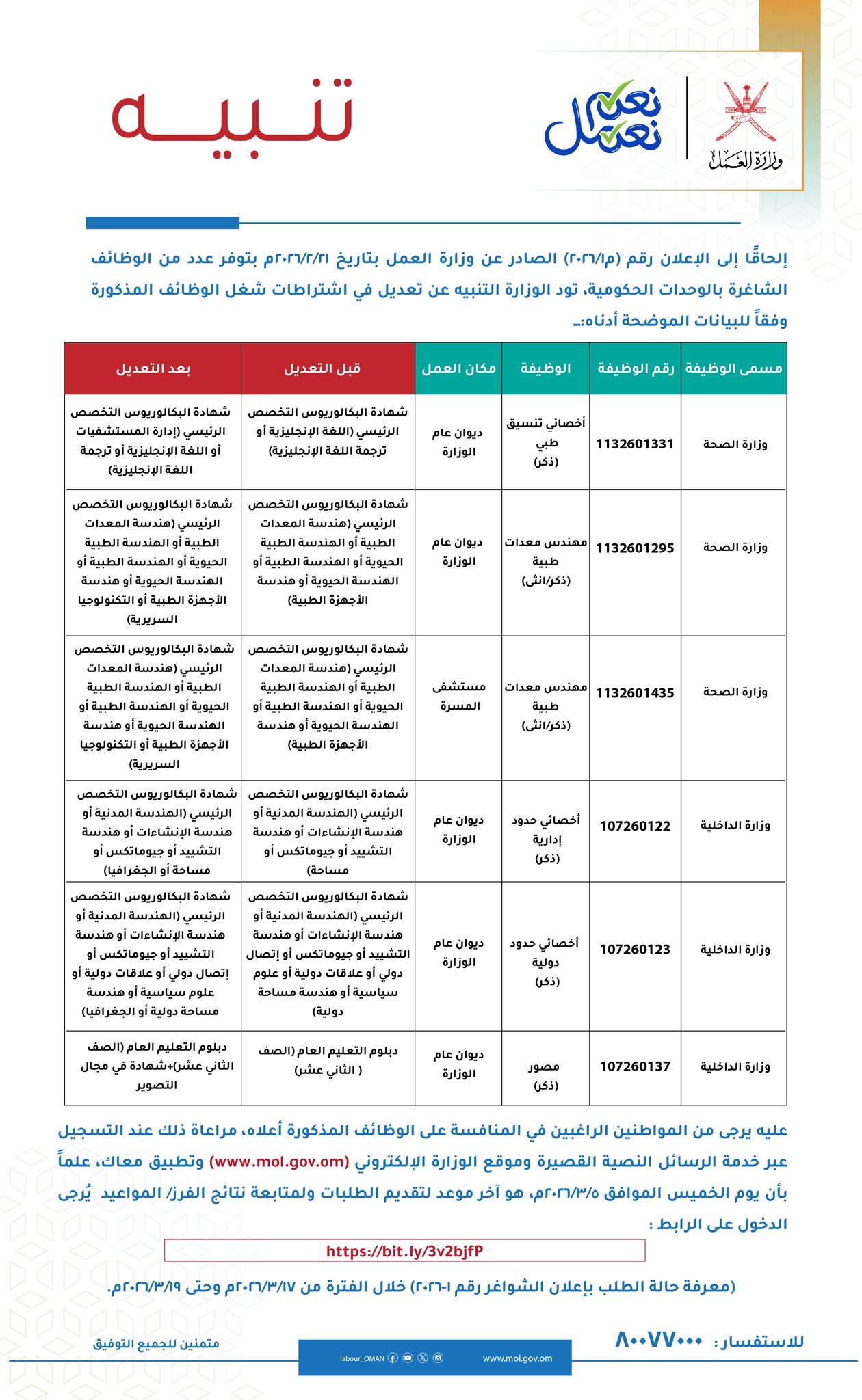 وزارة العمل - تود الوزارة التنبيه عن تعديل في اشتراطات شغل الوظائف المذكورة في ملحق رقم ( 1 / 2026 )