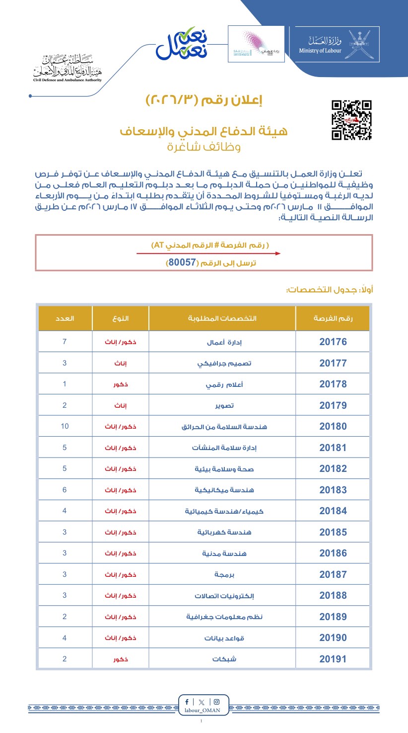 وزارة العمل بالتنسيق مع هيئة الدفاع المدني والإسعاف - توفر فرص وظيفية