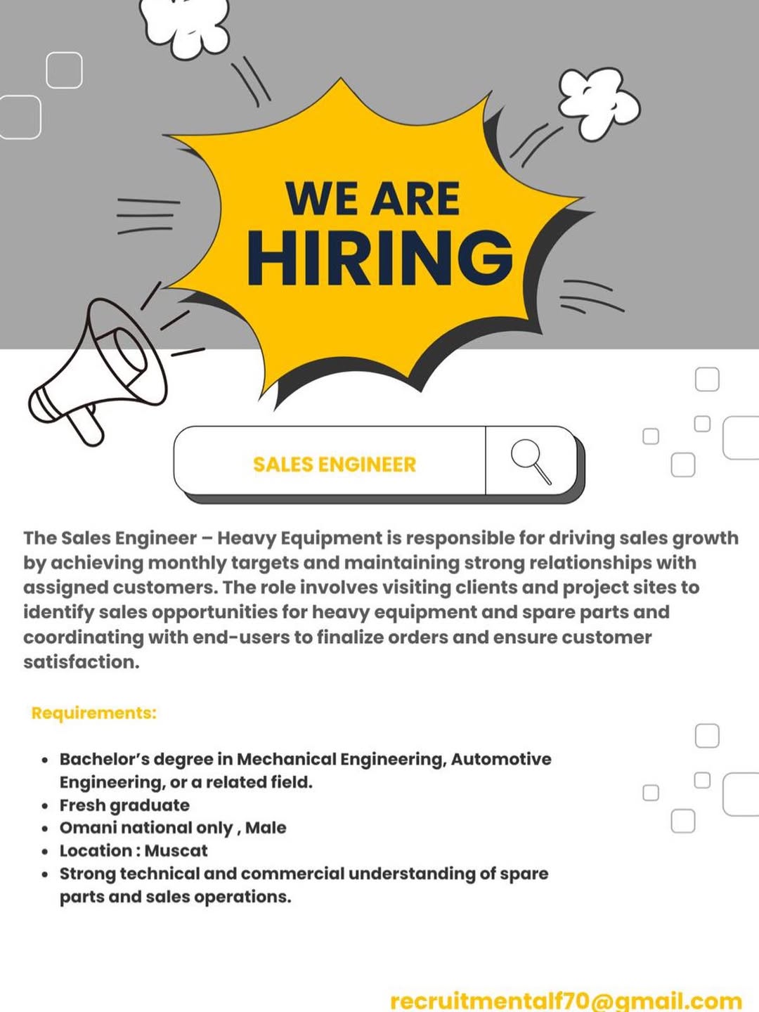 شركة معدات ثقيلة في مسقط - وظيفة شاغرة ( SALES ENGINEER )