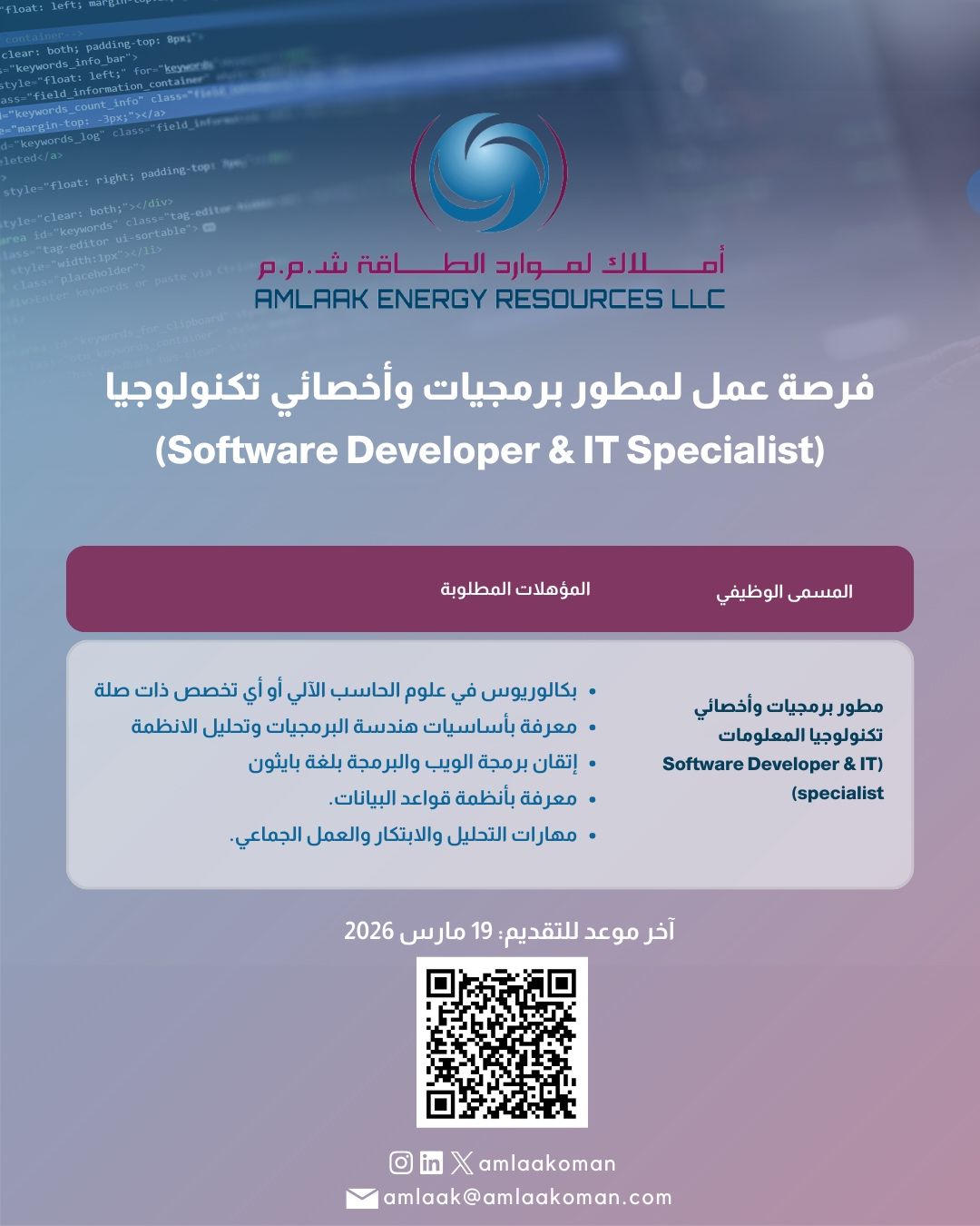 شركة أملاك لموارد الطاقة - توفر فرصة وظيفية لمطور برمجيات وأخصائي تكنولوجيا معلومات