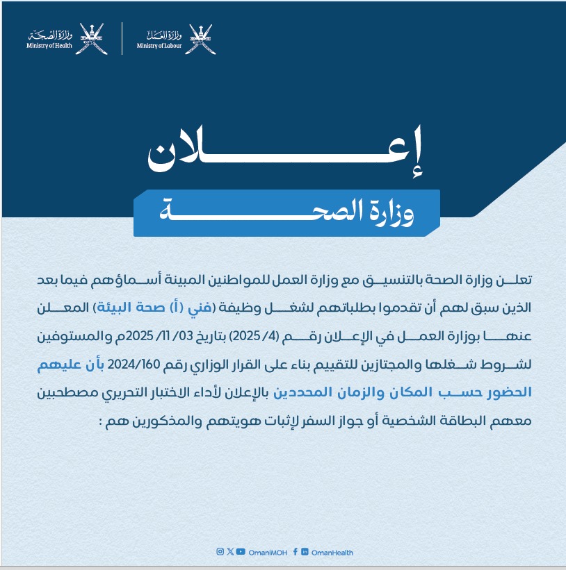 وزارة الصحة - اسماء المترشحين لأداء الاختبار التحريري لشغل وظائف (فني أ صحة البيئة + فني أ صحة مهنية، فني أ رقابة صحية