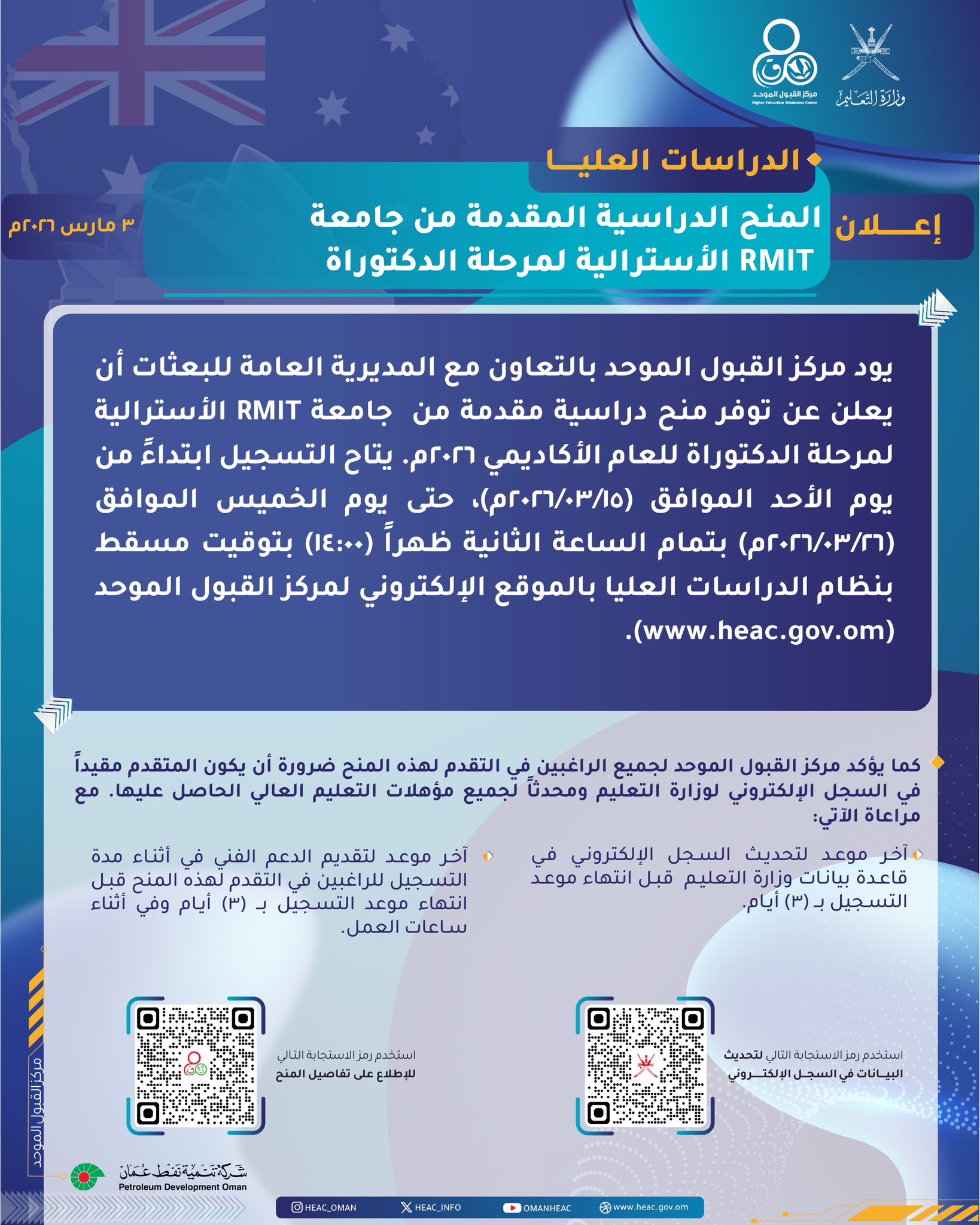 مركز القبول الموحد - إعلان بدء التسجيل في المنح الدراسية المقدمة من جامعة (RMIT) الأسترالية لبرامج الماجستير