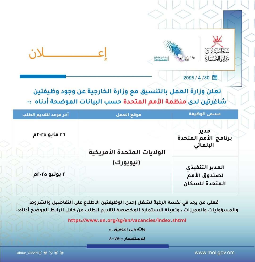 وزارة العمل بالتنسيق مع وزارة الخارجية - وظيفتين شاغرتين لدى منظمة الأمم المتحدة