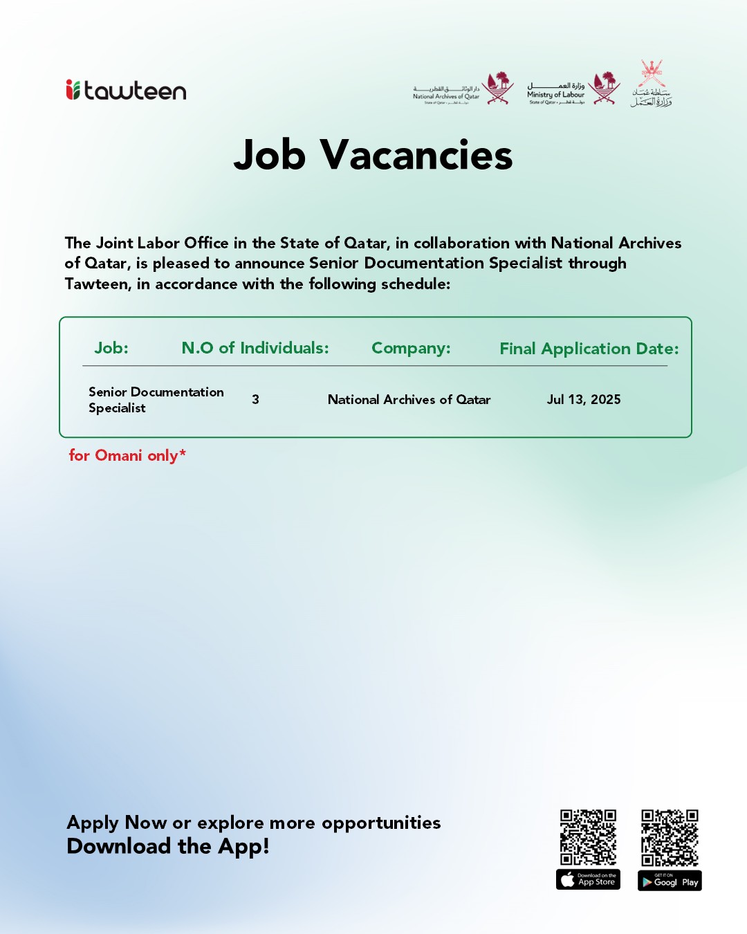 منصة توطين - مكتب العمل المشترك في دولة قطر بالتعاون مع دار الوثائق القطرية أن يعلن عن توفر وظيفة أخصائي أول إدارة