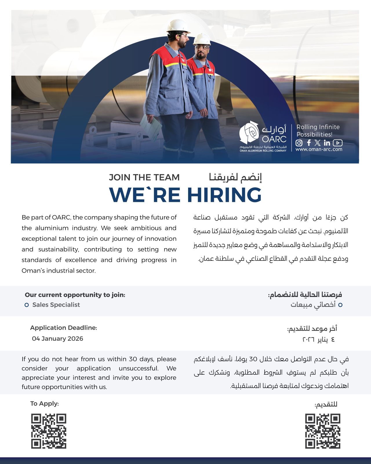 الشركة العمانية لدرفلة الألمنيوم أواوك - وظيفة شاغرة ( أخصائي مبيعات )