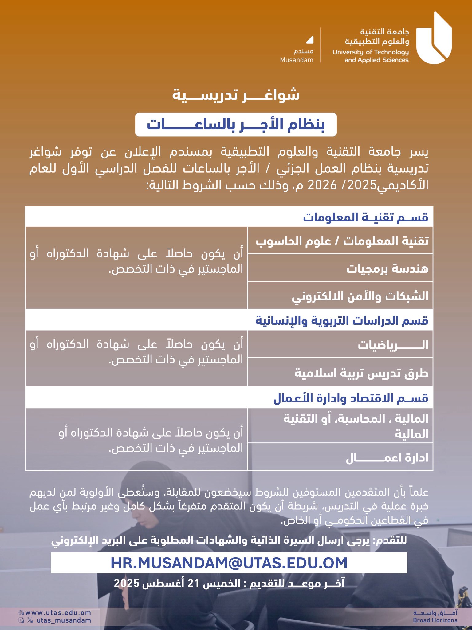 ارسل السيرة الذاتية على الايميل HR.MUSANDAM@utas.edu.om