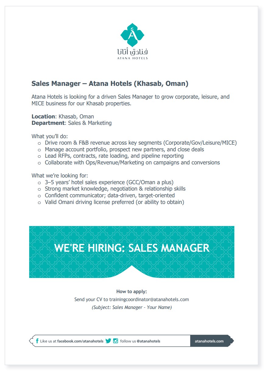 ارسل السيرة الذاتية على الايميل trainingcoordinator@atanahote ls.com