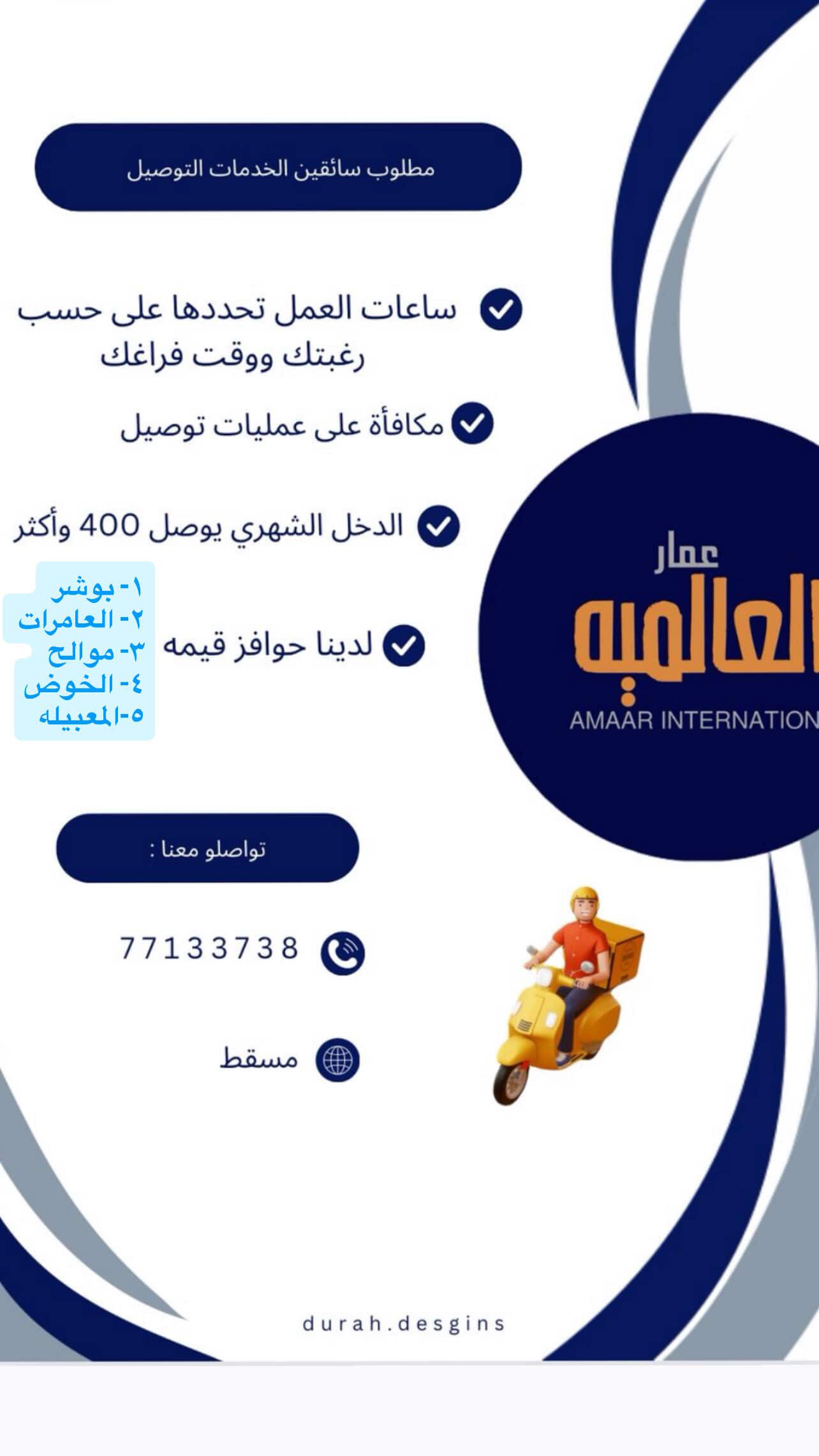 شركة عمار العالمية - فرص شاغرة ( سائقين الخدمات التوصيل )