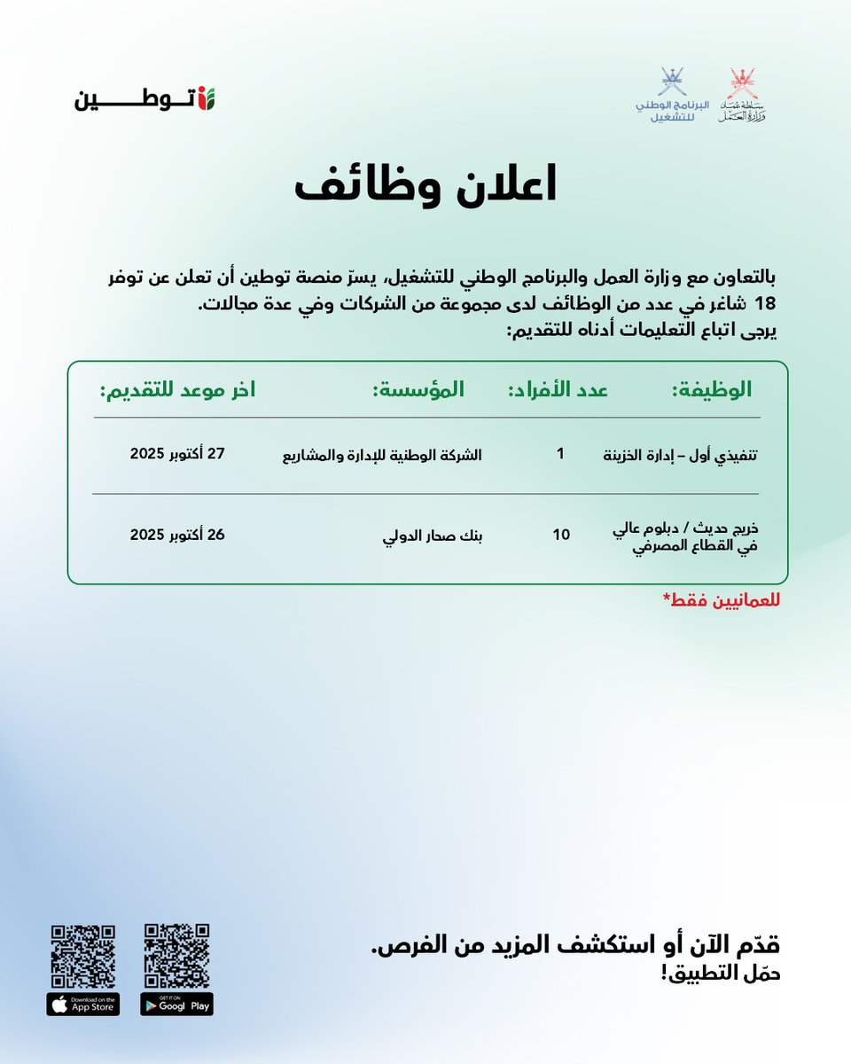 وزارة العمل ممثلة بالمديرية العامة للعمل في محافظة الظاهرة - توفر فرص عمل وظيفية في مؤسسات القطاع الخاص