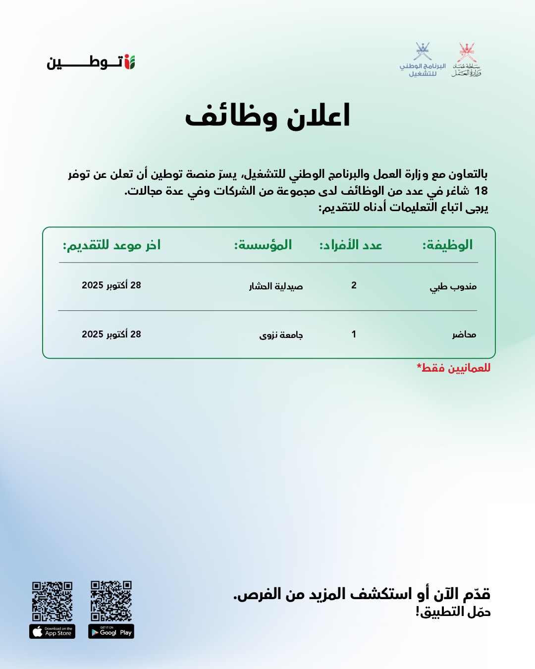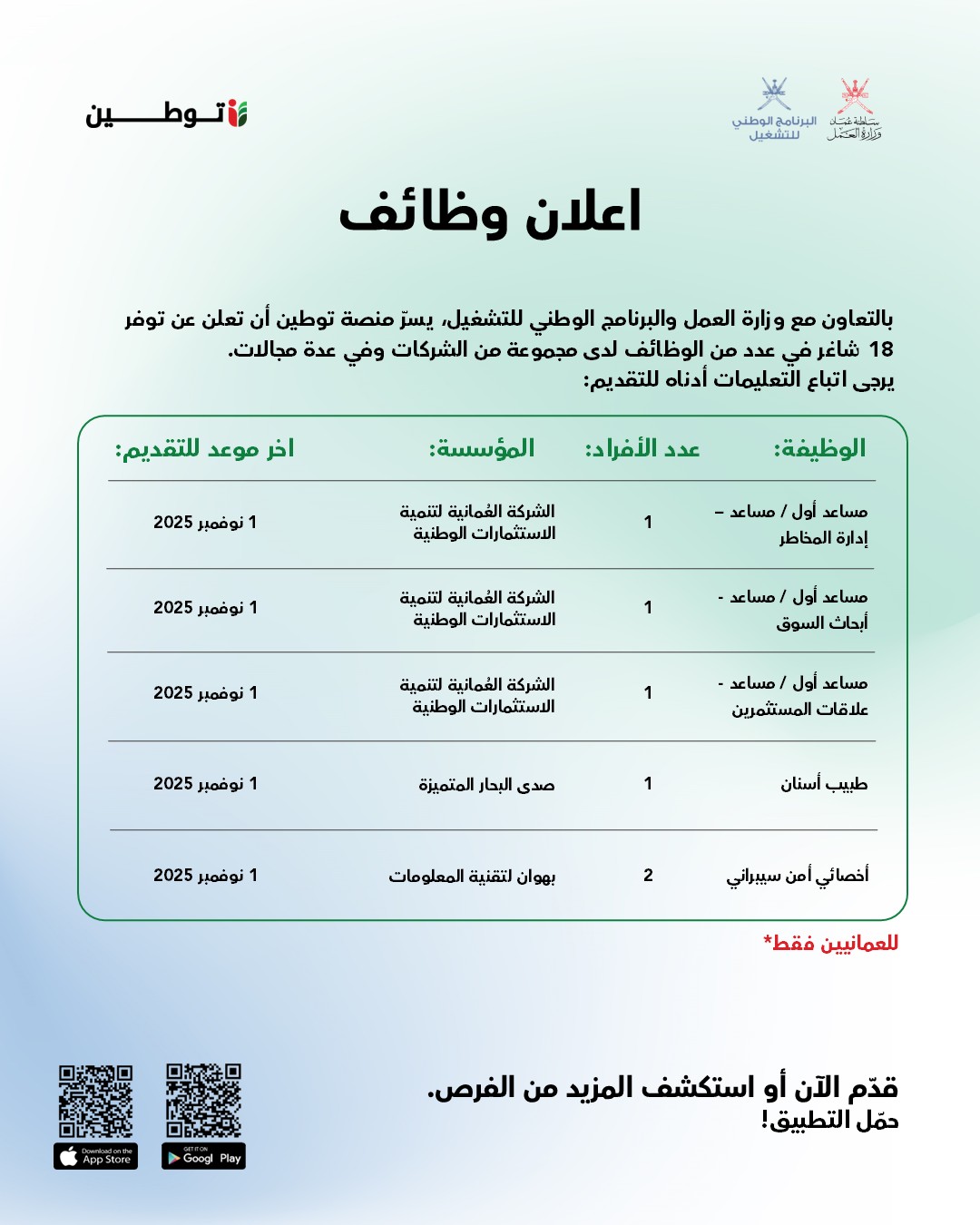 منصة توطين - 18 شاغر في عدد من الوظائف لدى مجموعة من الشركات وفي عدة مجالات