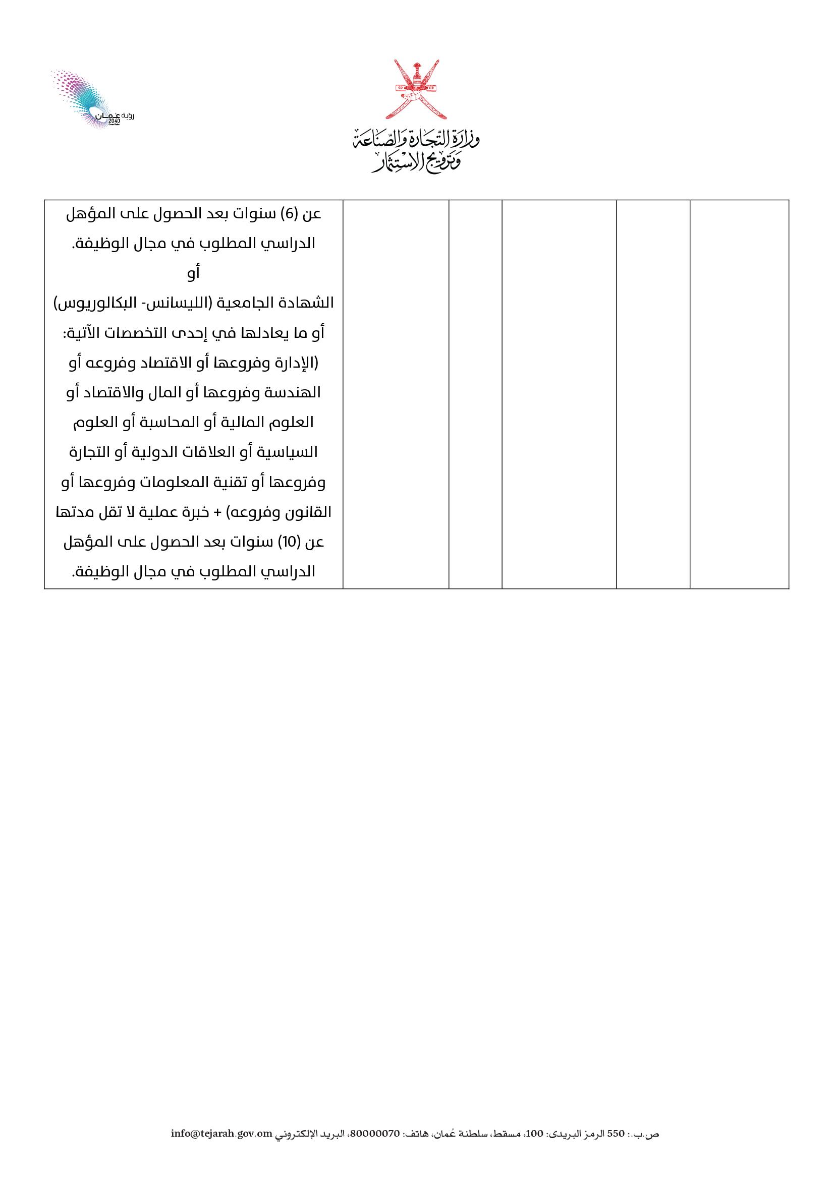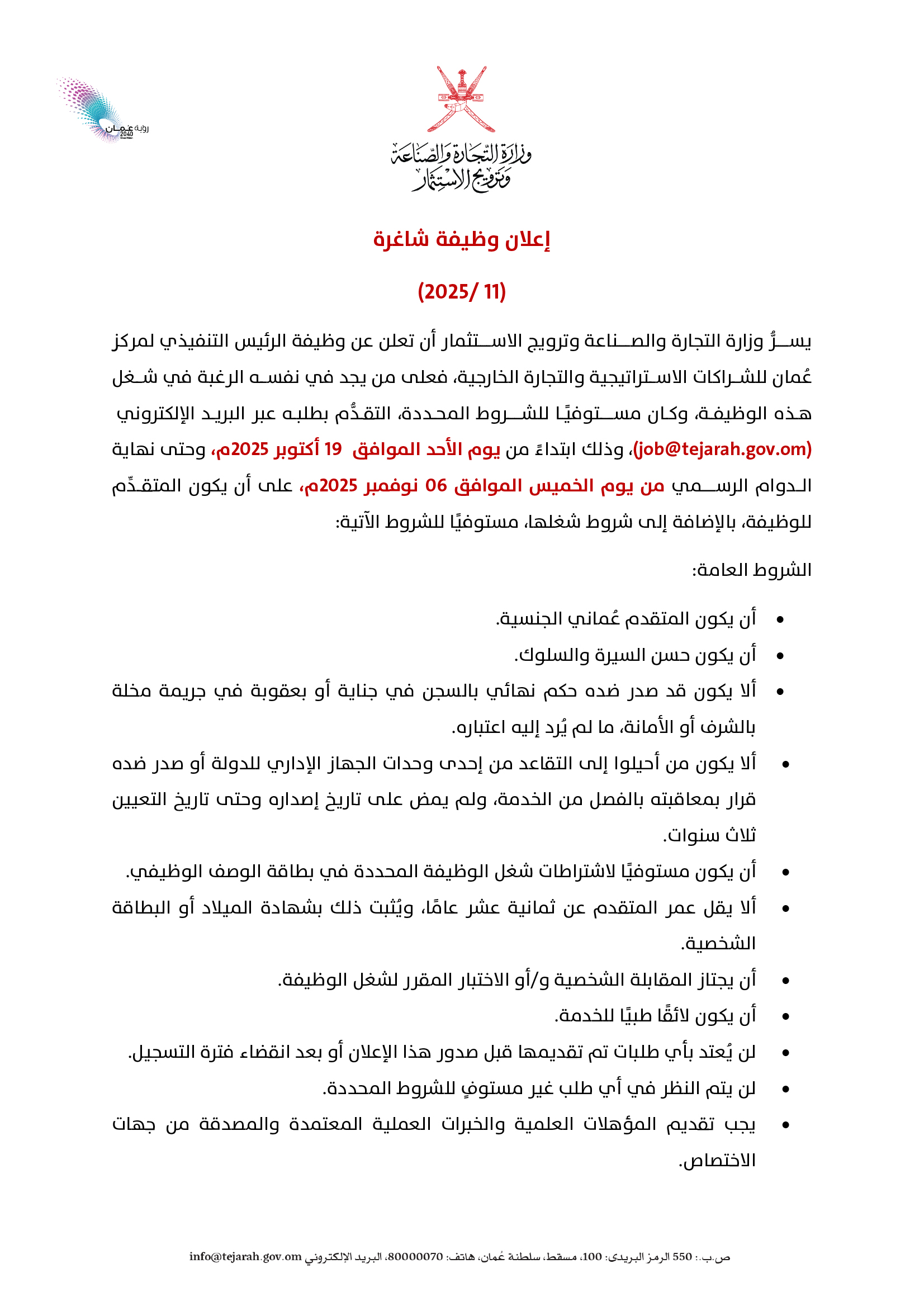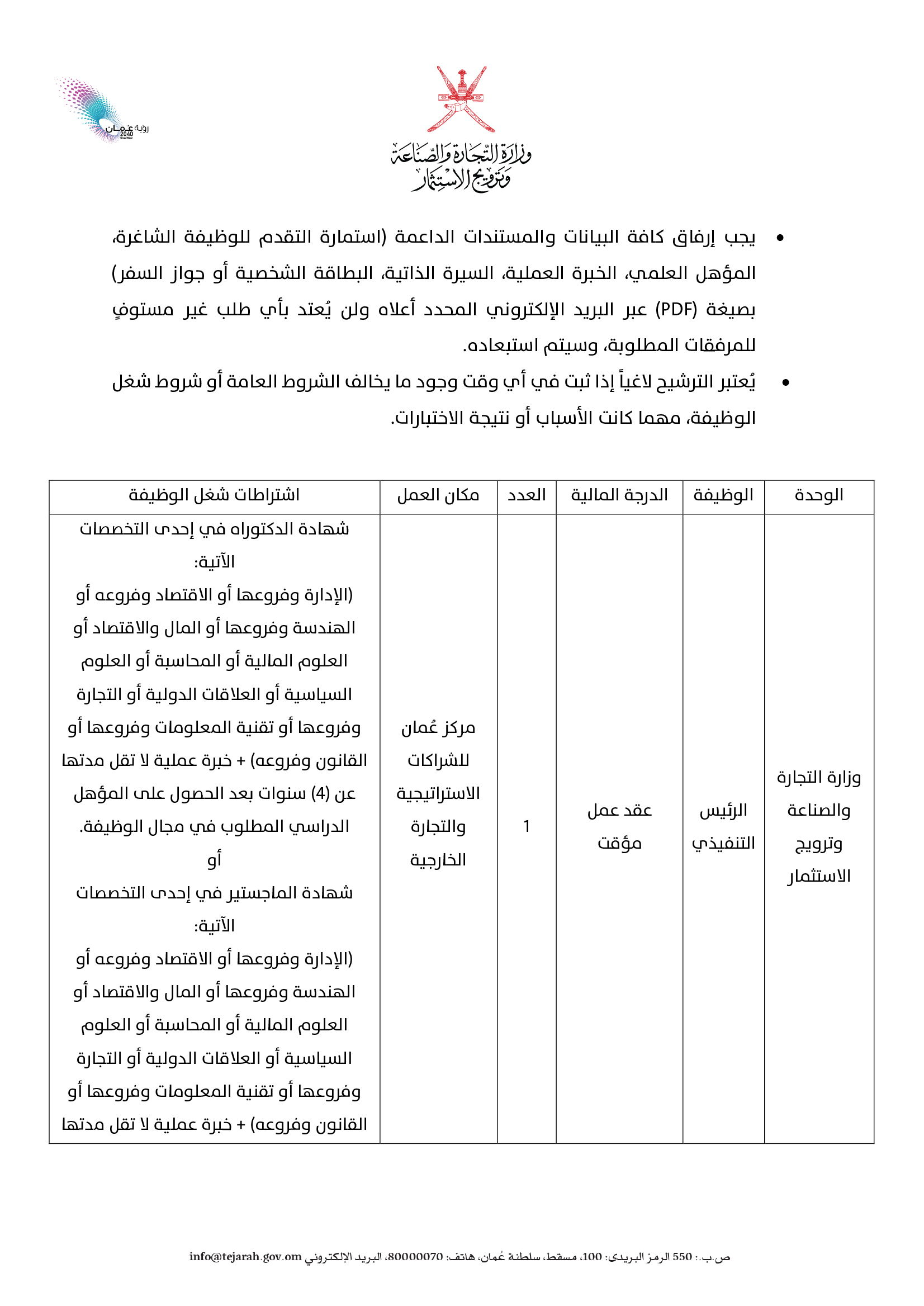 ارسل السيرة الذاتية على الايميل job@tejarah.gov.om
