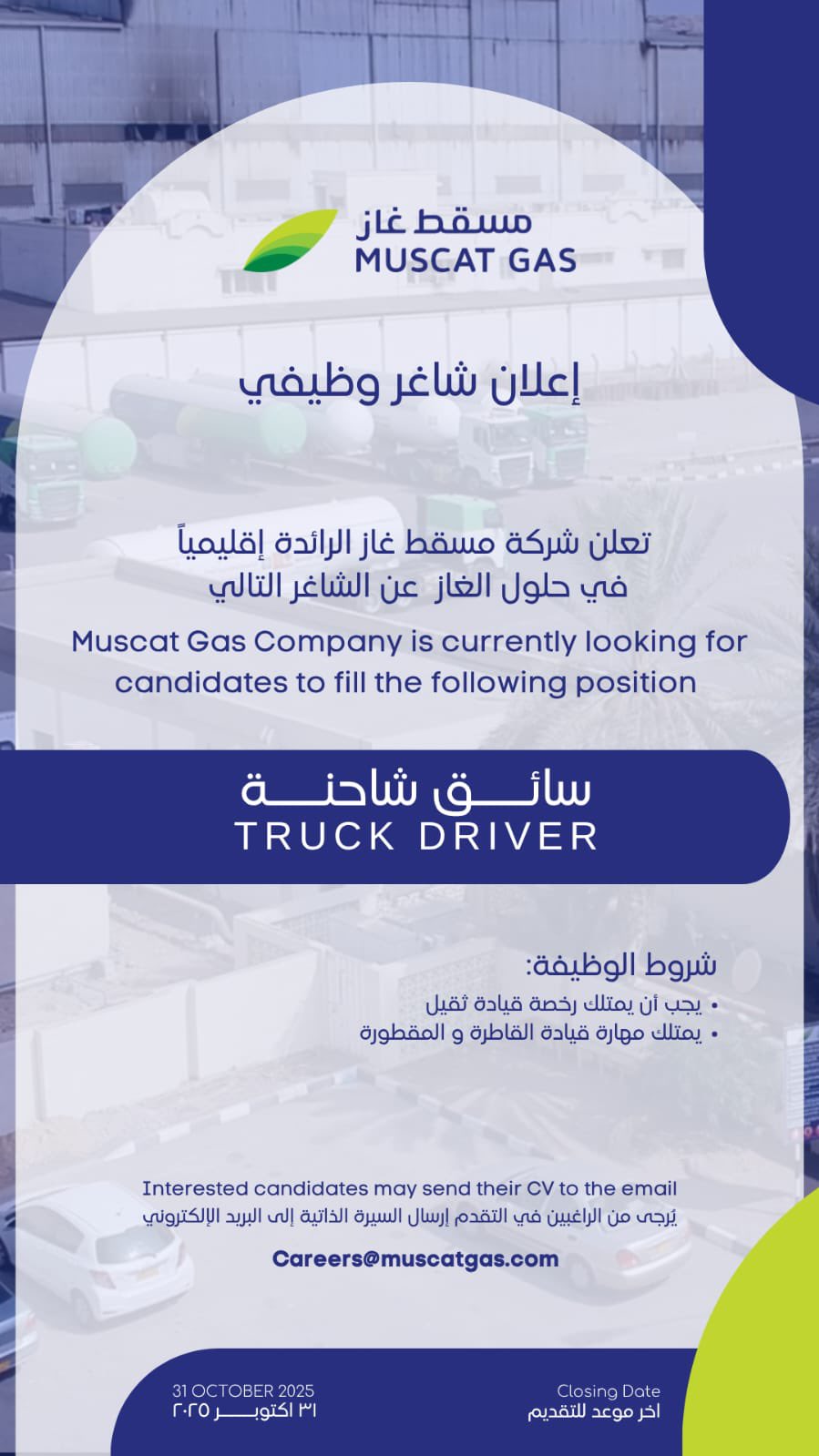 ارسل السيرة الذاتية على الايميل Careers@muscatgas.com