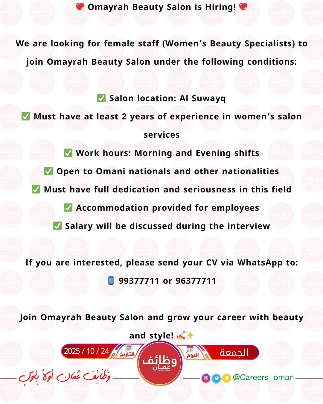 صالون عميرة للتجميل بالسويق - وظيفة شاغرة ( موظفات تجميل نساء )