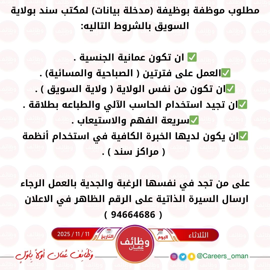مكتب سند بولاية السويق - وظيفة شاغرة ( مدخلة بيانات )