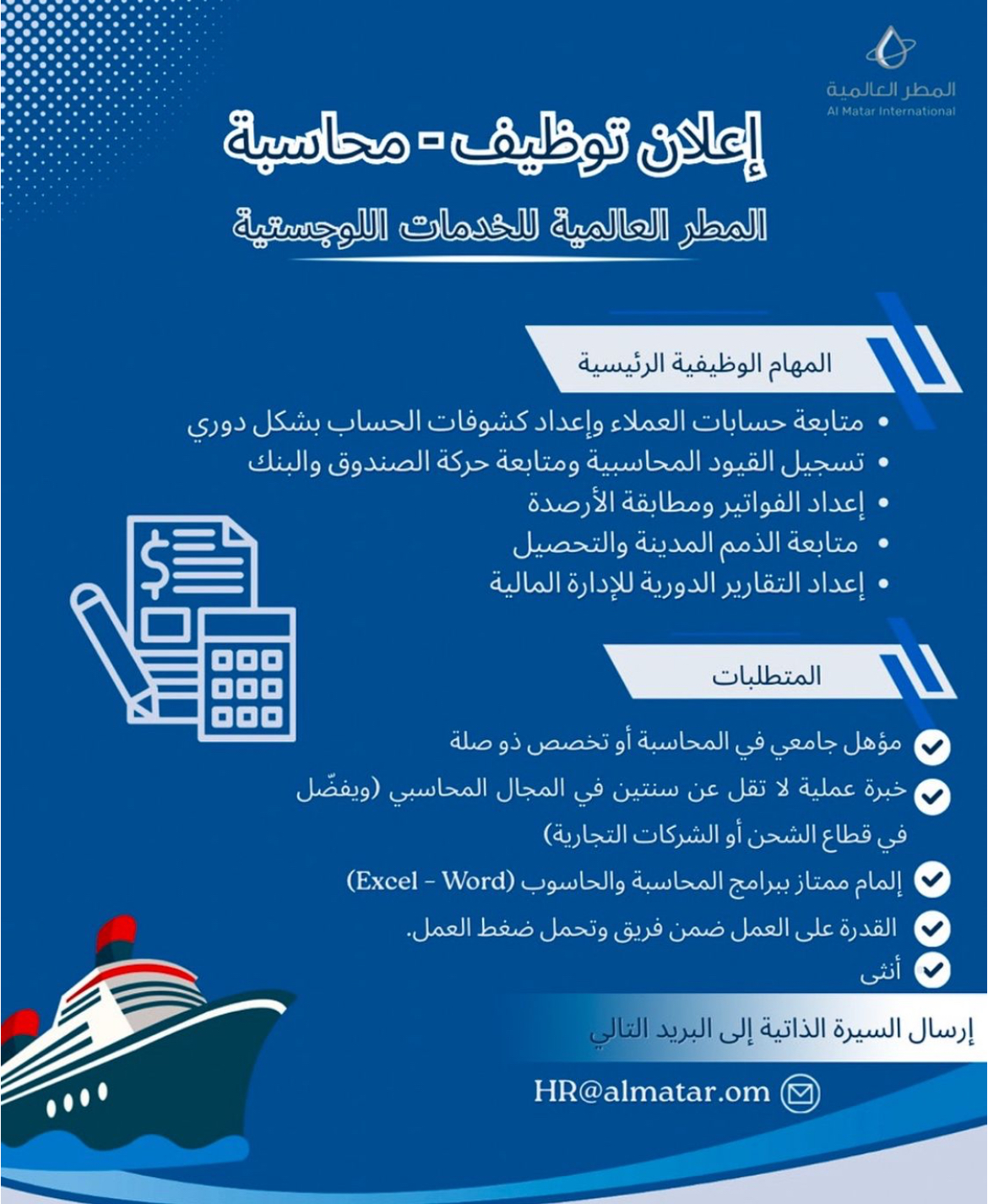 شركة المطر العالمية للخدمات اللوجستية - وظيفة شاغرة ( محاسبة )