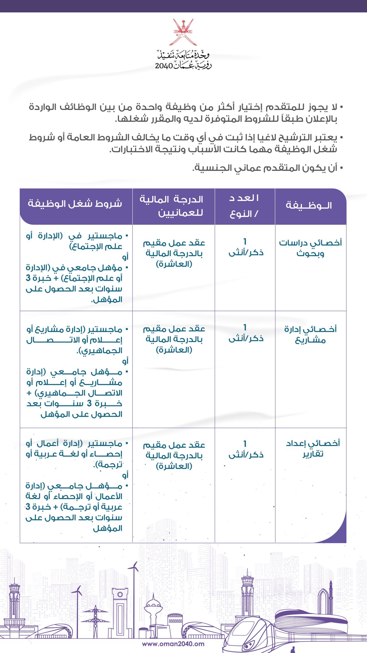 ارسل السيرة الذاتية على الايميل careers@oman2040.om