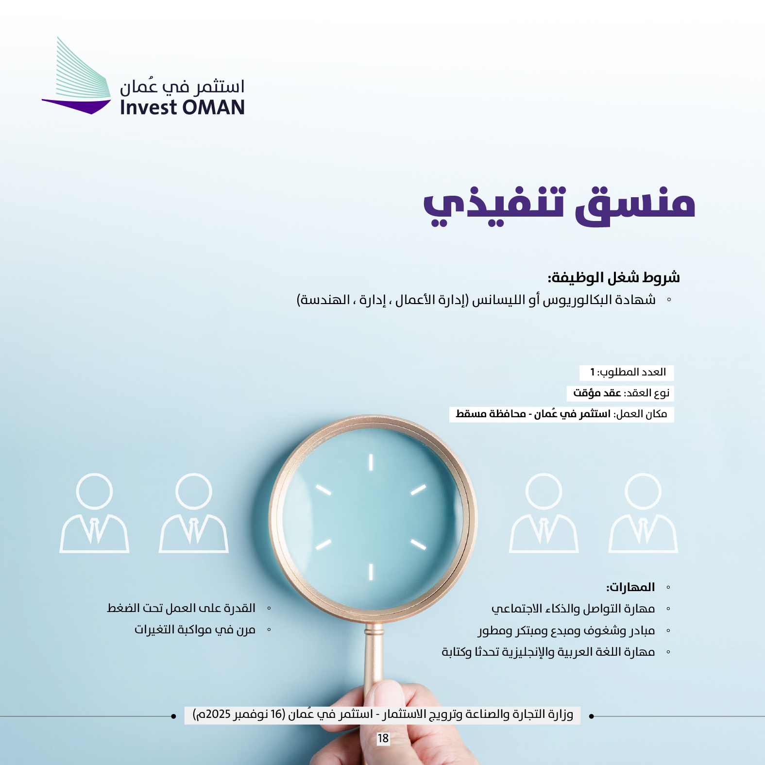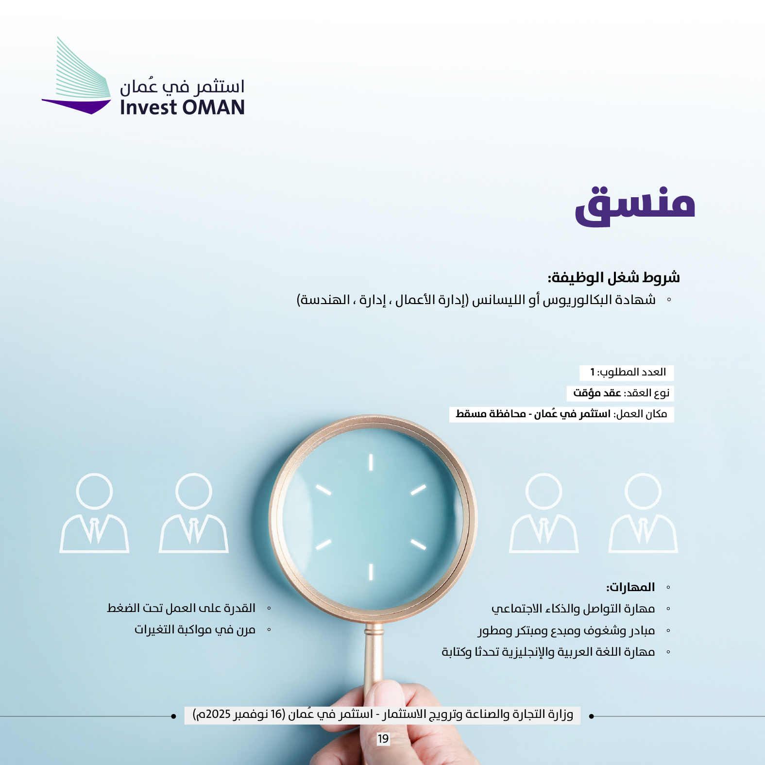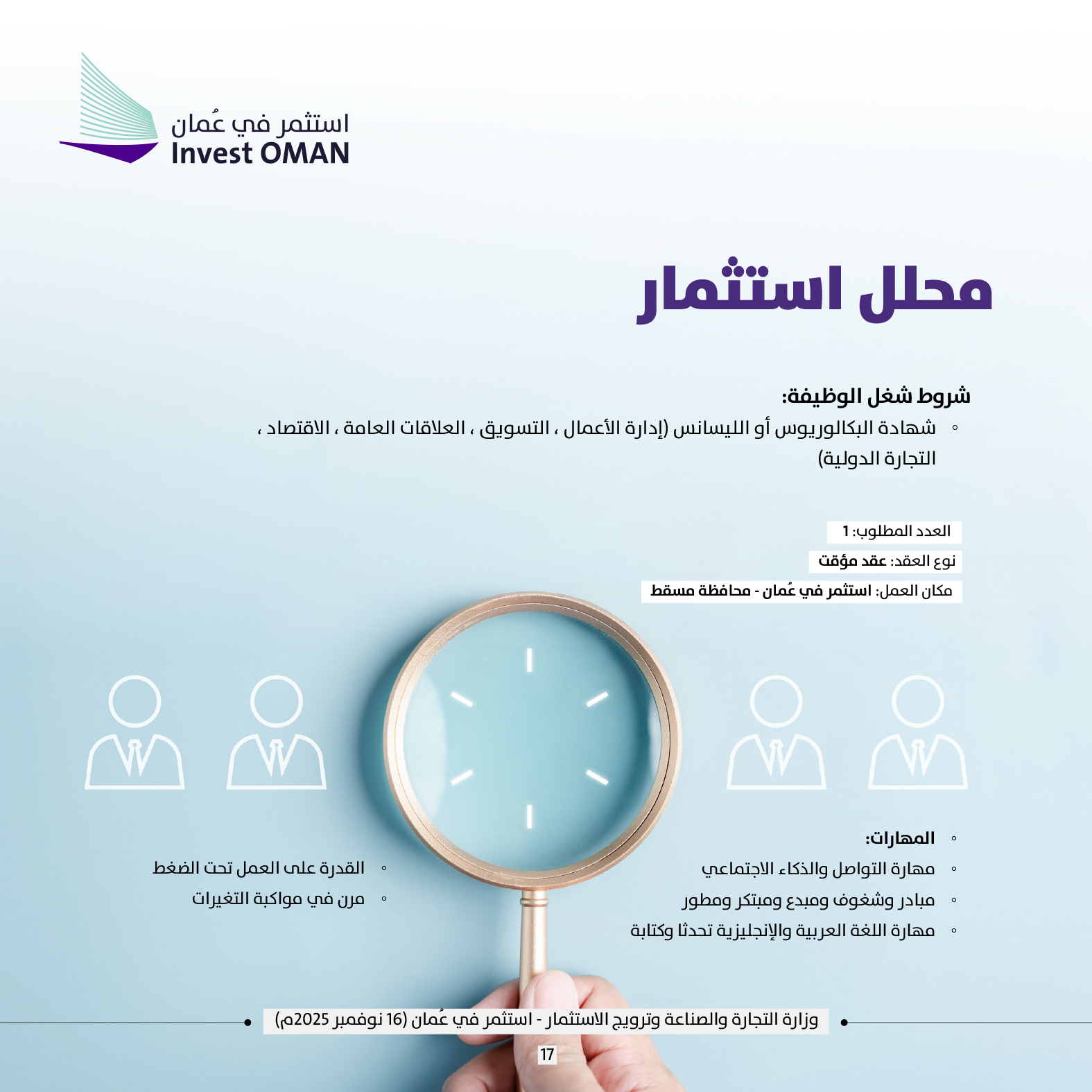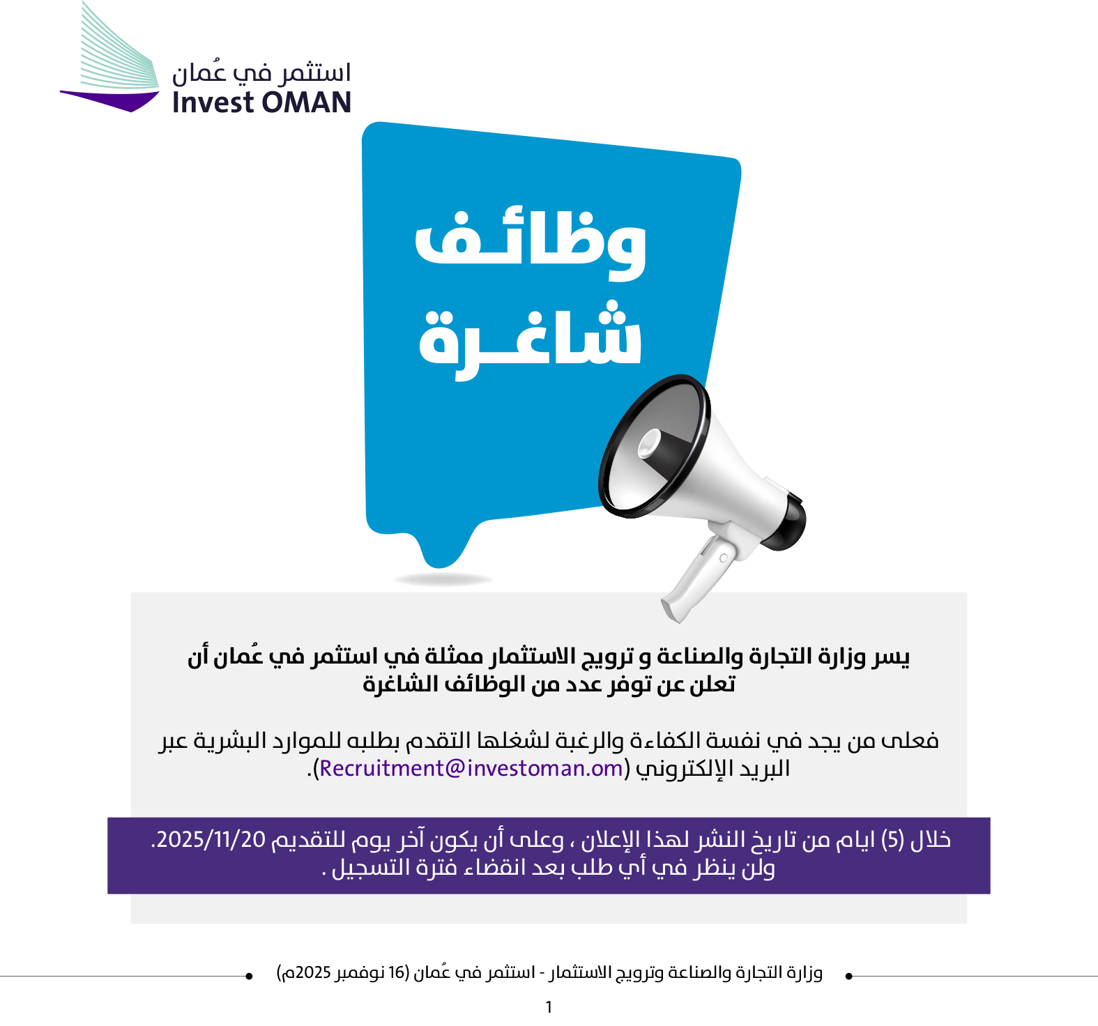 فعلى من يجد في نفسه الكفاءة والرغبة لشغلها التقدم بطلبه للموارد البشرية عبر البريد الإلكتروني (Recruitment@investoman.om).