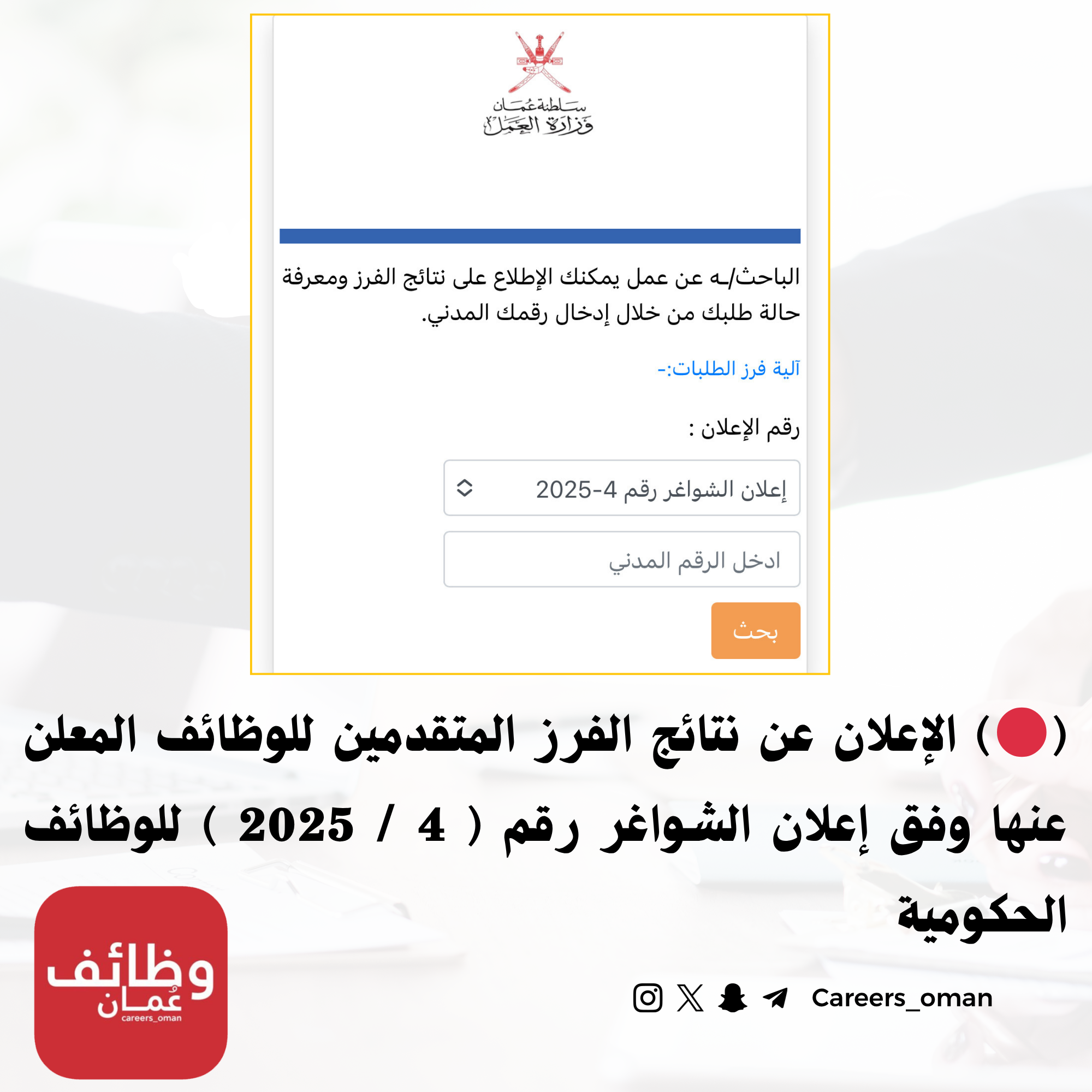 للاطلاع على نتائج الفرز من خلال الرابط https://myservices.mol.gov.om/tawtheef/login.aspx?fbclid=PAdGRleAOJX4NleHRuA2FlbQIxMQBzcnRjBmFwcF9pZA8xMjQwMjQ1NzQyODc0MTQAAae1HLPloYPPt2y4Z7anpFNfi9PYJMZhbolyrhs7F406yZV66zwPgT80hhKGjQ_aem_Tm5Yn8_U3NCFSzMhIwSVwQ