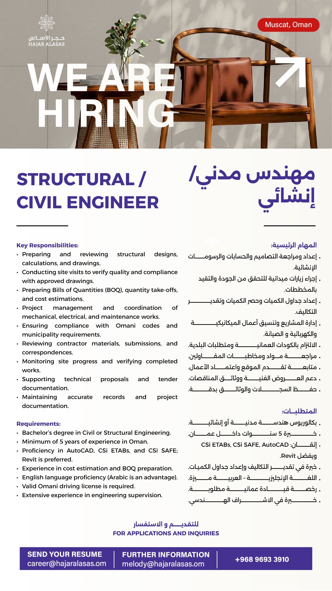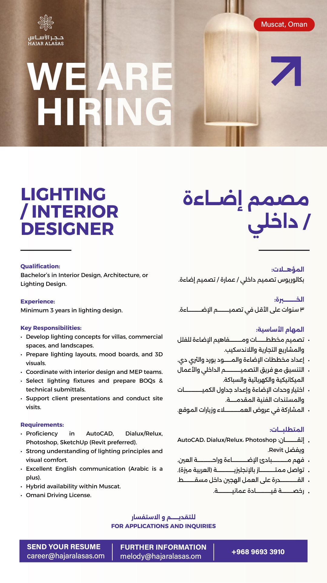 شركة حجر الأساس للاستشارات الهندسية في الموالح - فرص وظيفية شاغرة ( مهندس مدني/إنشائي + مصمم إضاءة/داخلي )