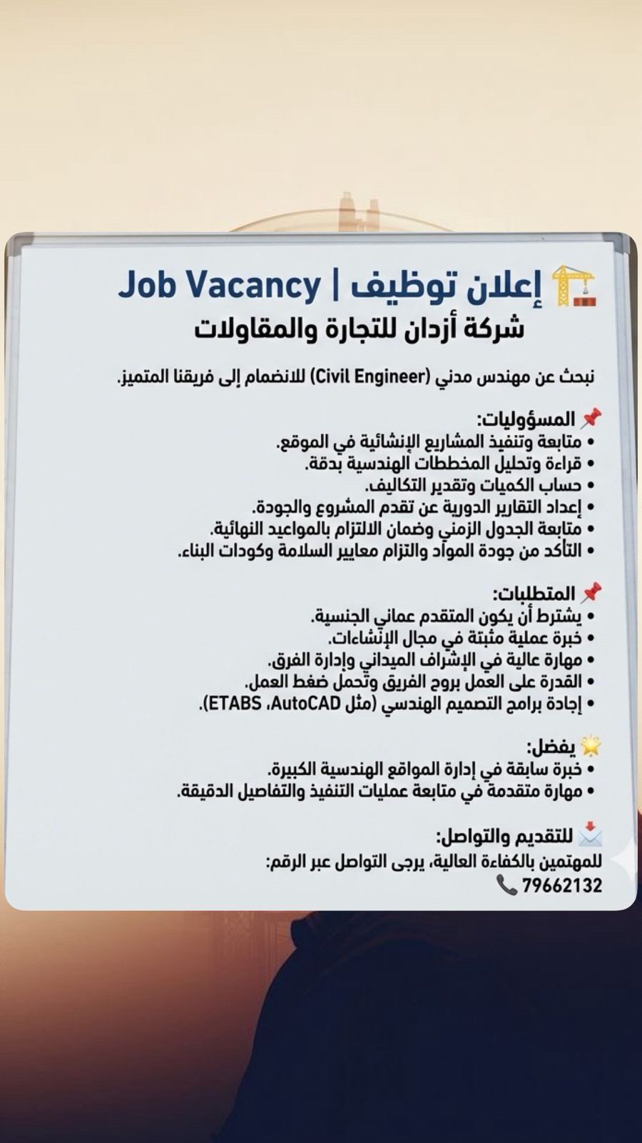 شركة أزدان للتجارة والمقاولات - وظيفة شاغرة ( مهندس مدني )