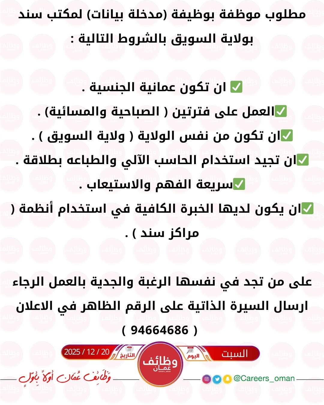 مكتب سند بولاية السويق - وظيفة شاغرة ( مدخلة بيانات )