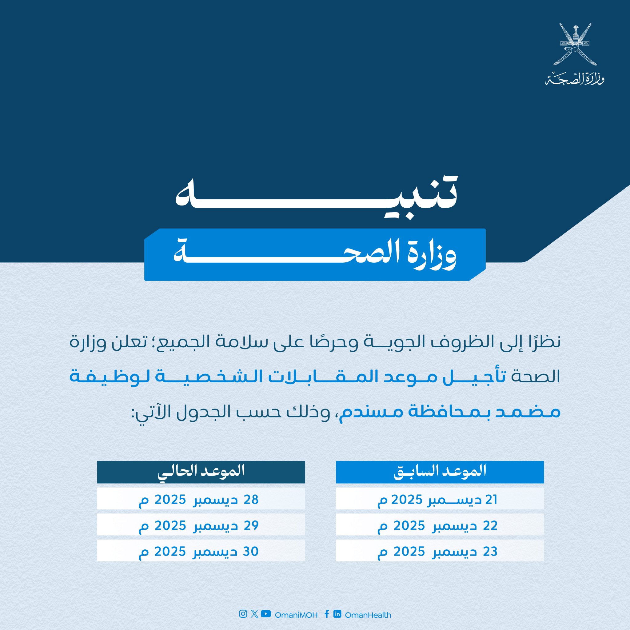 وزارة الصحة - تنبيه | تأجيل مقابلات وظيفة مضمد بمحافظة مسندم