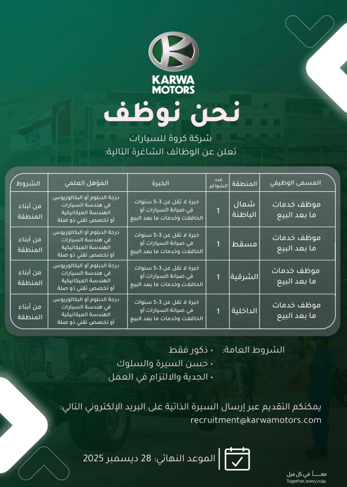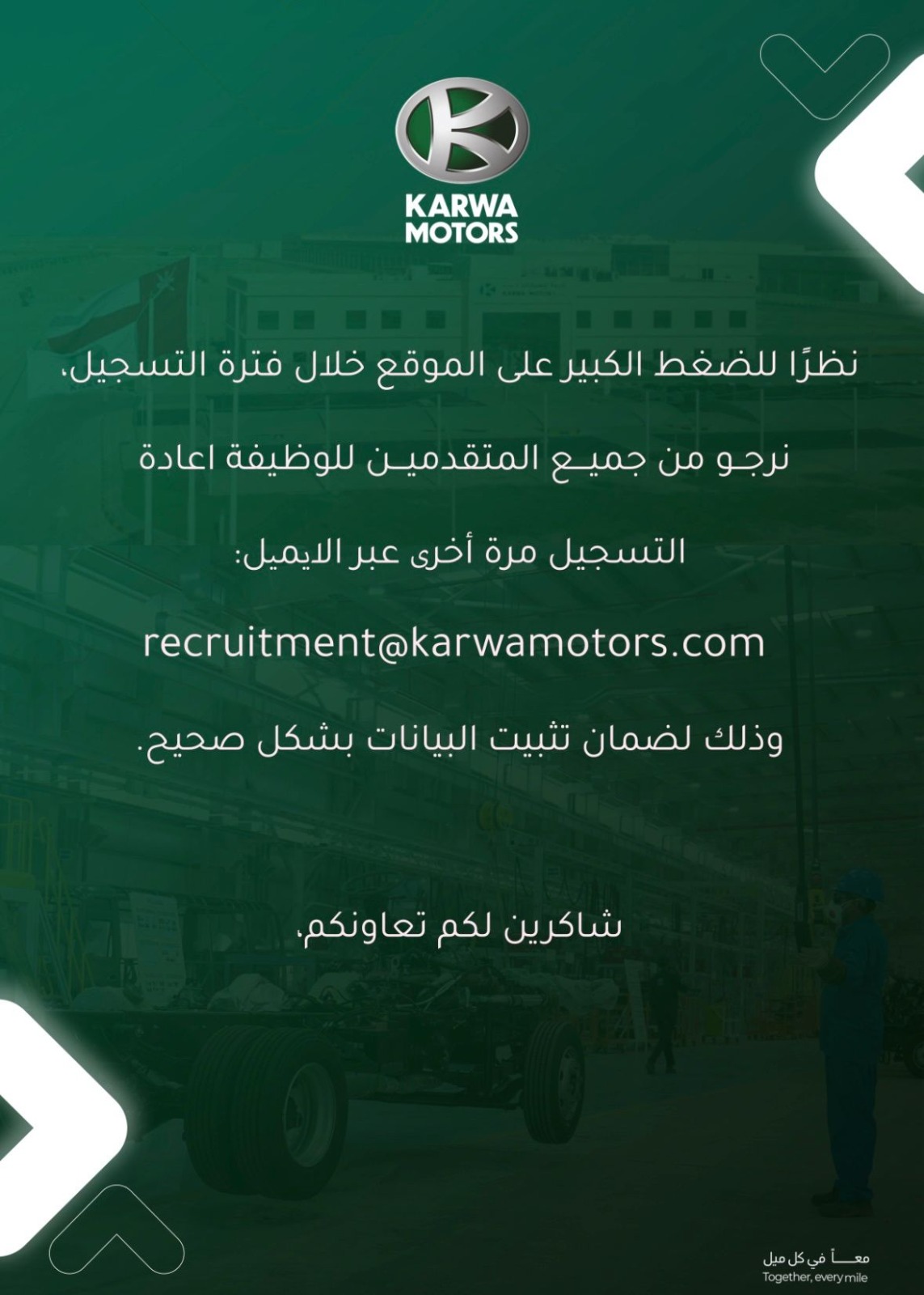 ارسل السيرة الذاتية على الايميل recruitment@karwamotors.com