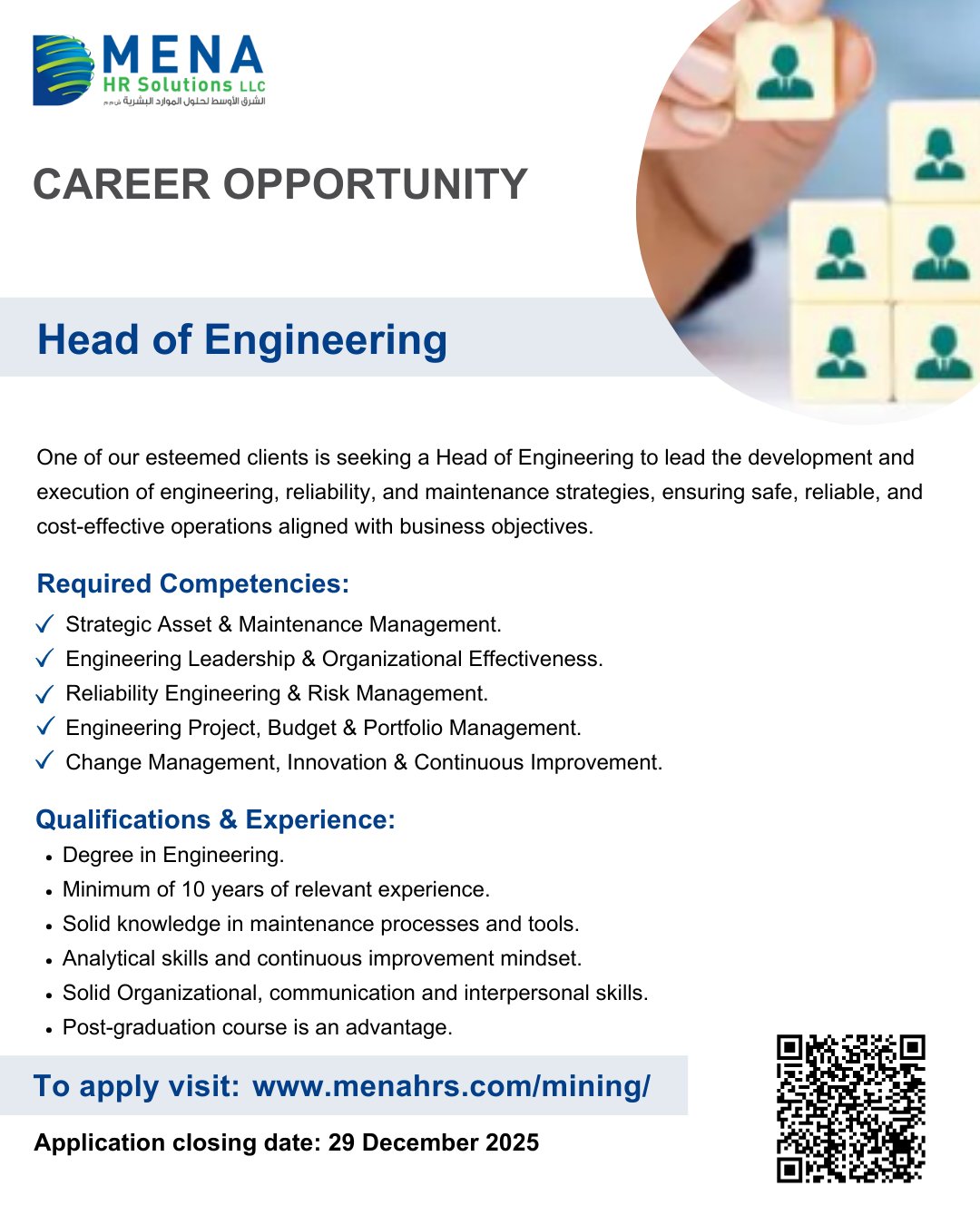 الشرق الأوسط لحلول الموارد البشرية - وظيفة شاغرة ( Head of Engineering )