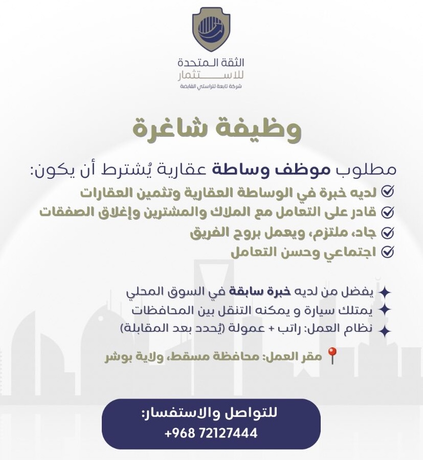 الثقة المتحدة للاستثمار في بوشر - وظيفة شاغرة ( موظف وساطة عقارية )