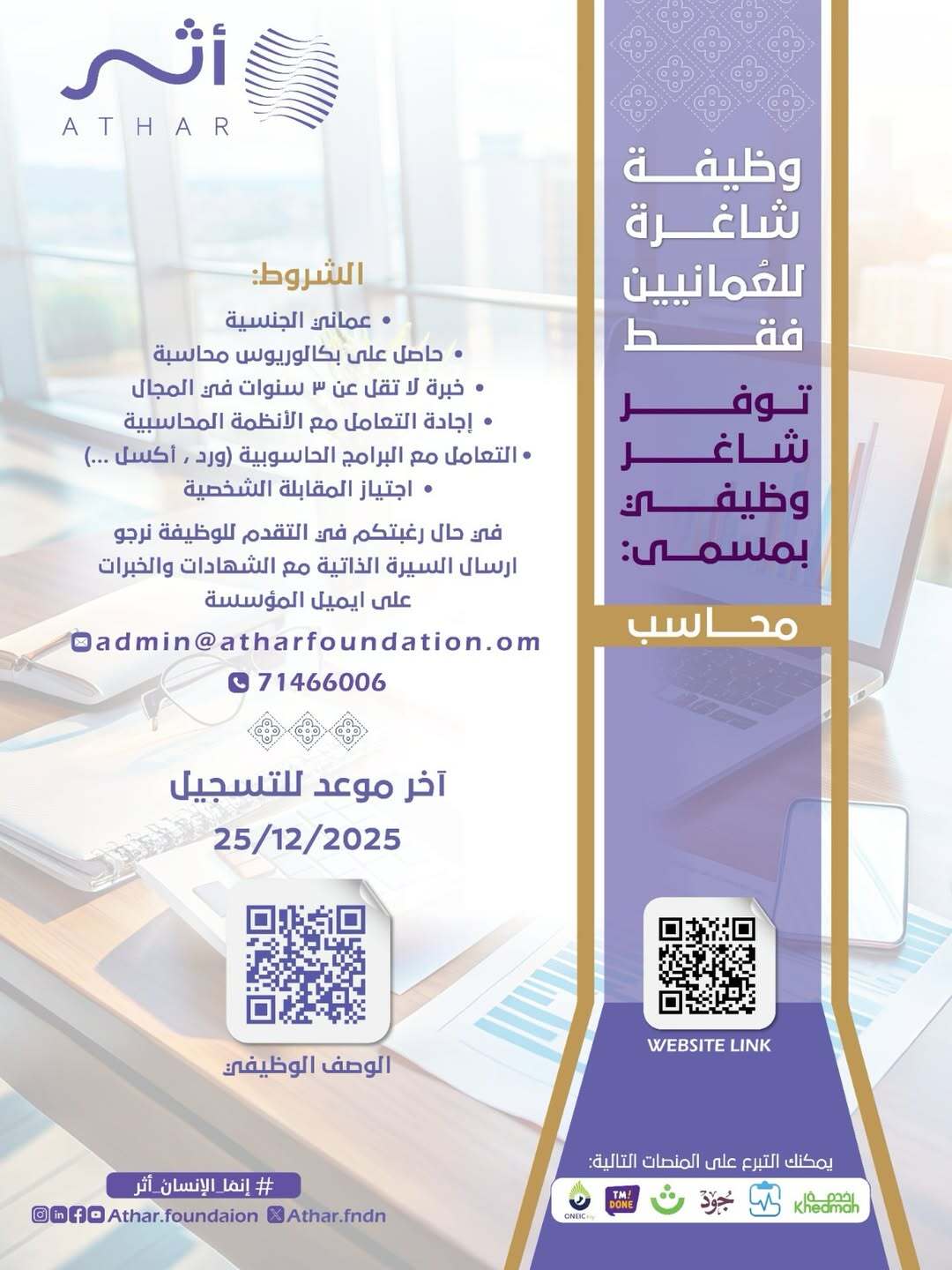 ارسل السيرة الذاتية على الايميل admin@atharfoundation.om
