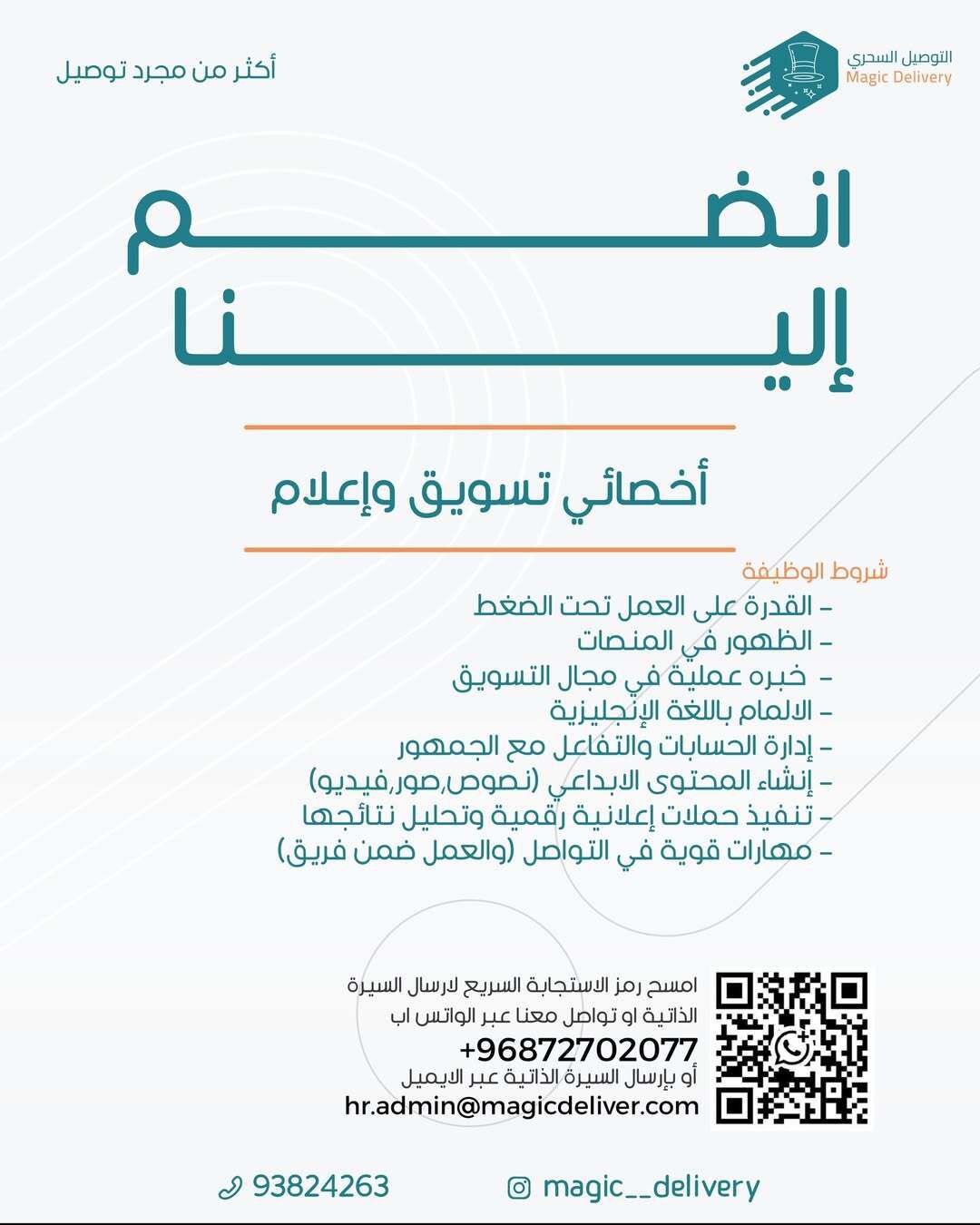 ارسل السيرة الذاتية على الايميل hr.admin@magicdeliver.com