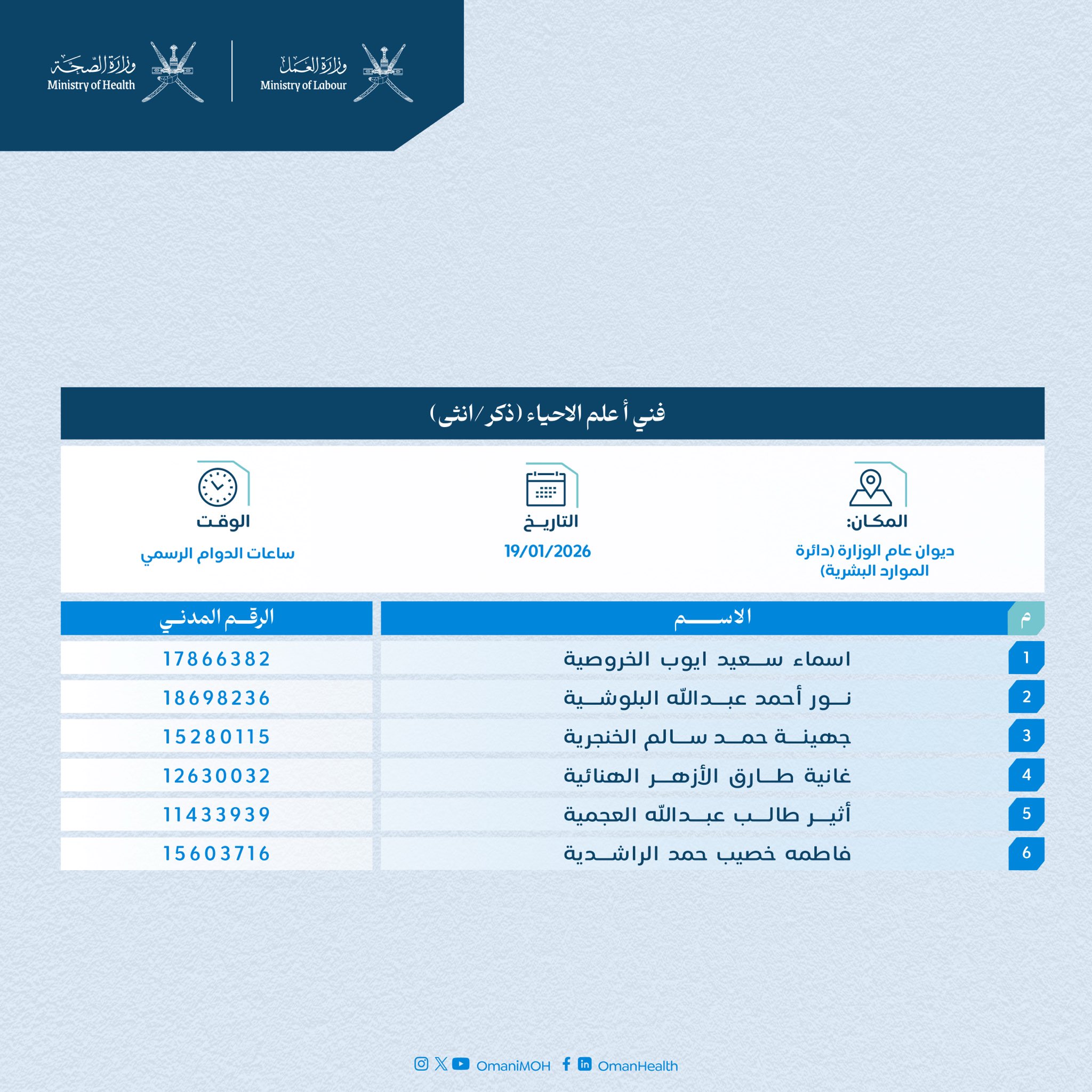 وزارة الصحة - اسماء المترشحين لإنهاء إجراءات توقيع عقود التدريب الخاصة بهم لشغل وظيفة (فني ب تعقيم)