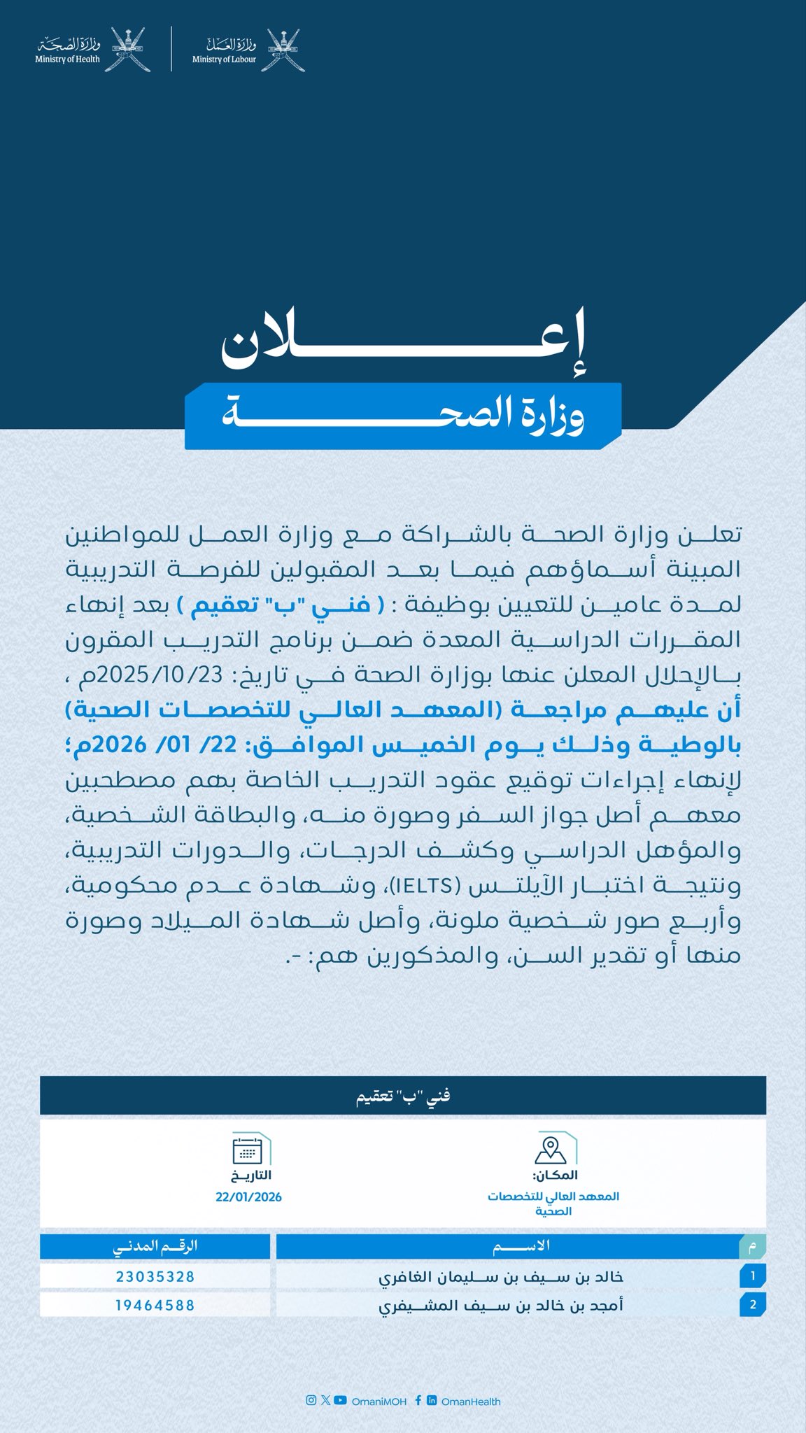 وزارة الصحة - اسماء المترشحين لإنهاء إجراءات توقيع عقود التدريب الخاصة بهم لشغل وظيفة (فني ب تعقيم)