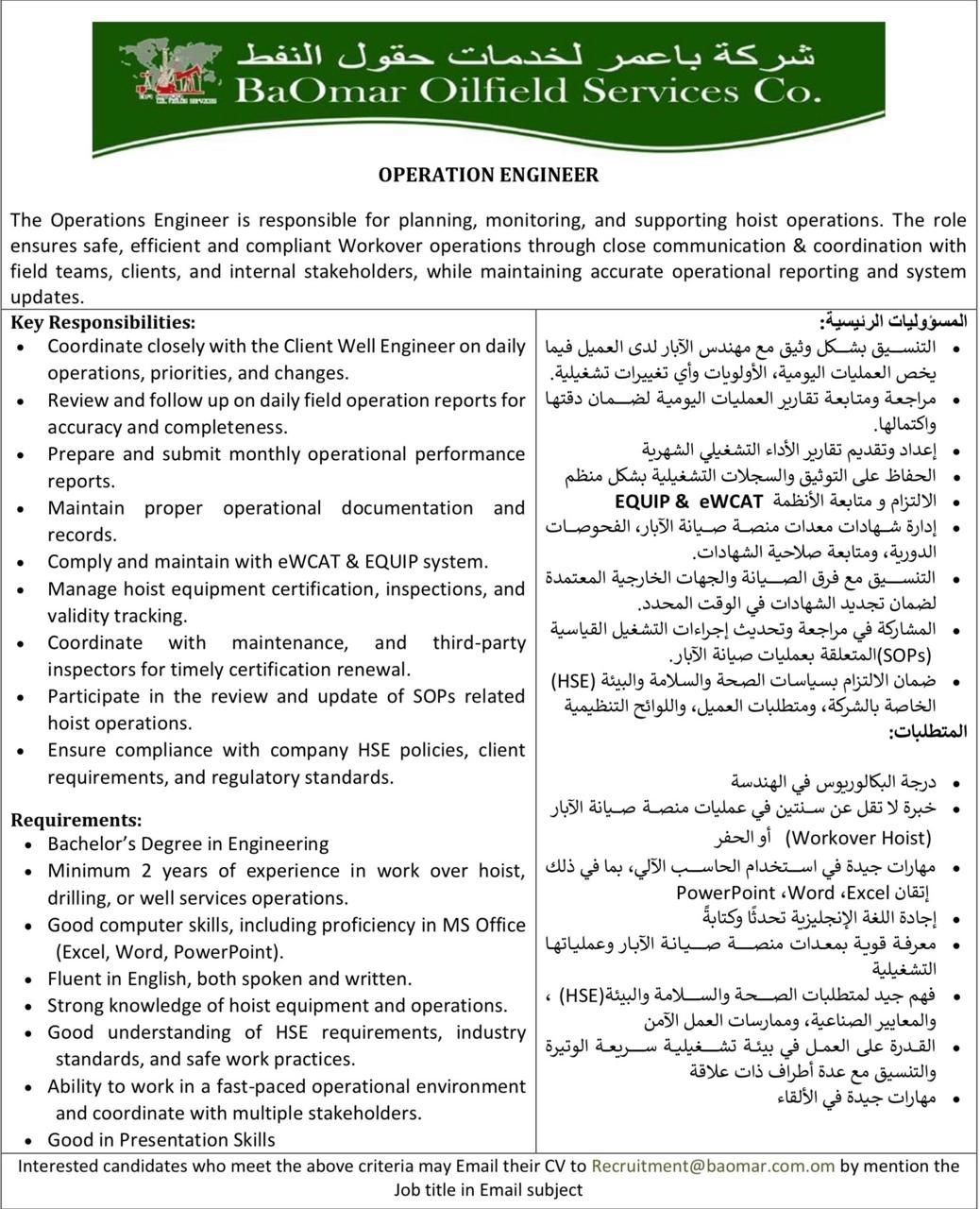 ارسل السيرة الذاتية على الايميل Recruitment@baomar.com.om