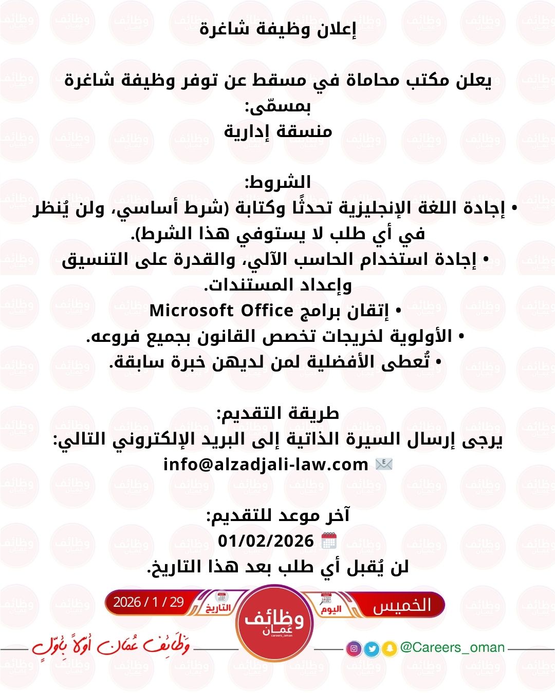 ارسل السيرة الذاتية على الايميل info@alzadjali-law.com