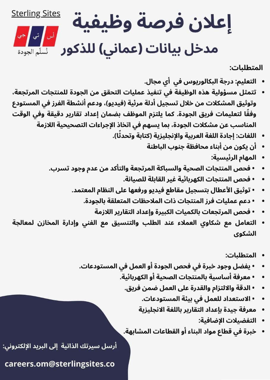 ارسل السيرة الذاتية على الايميل careers.om@sterlingsites.co