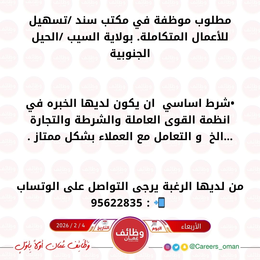 مكتب سند للخدمات في السيب - وظيفة شاغرة ( موظفة )