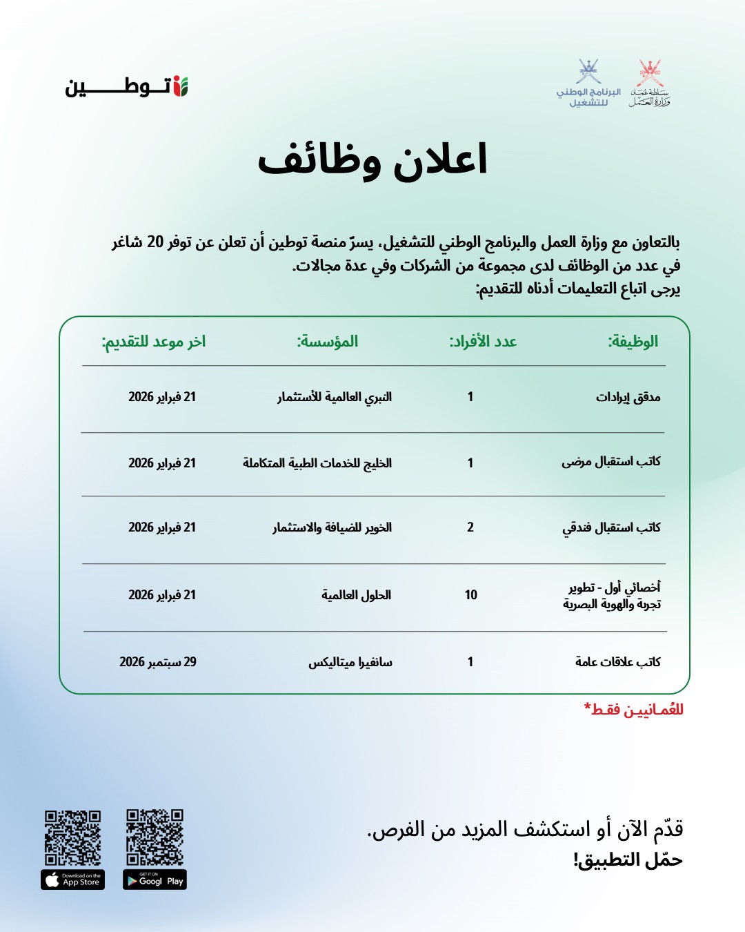 منصة توطين - توفر 20 شاغر وظيفي لدى مجموعة من الشركات وفي عدة مجالات