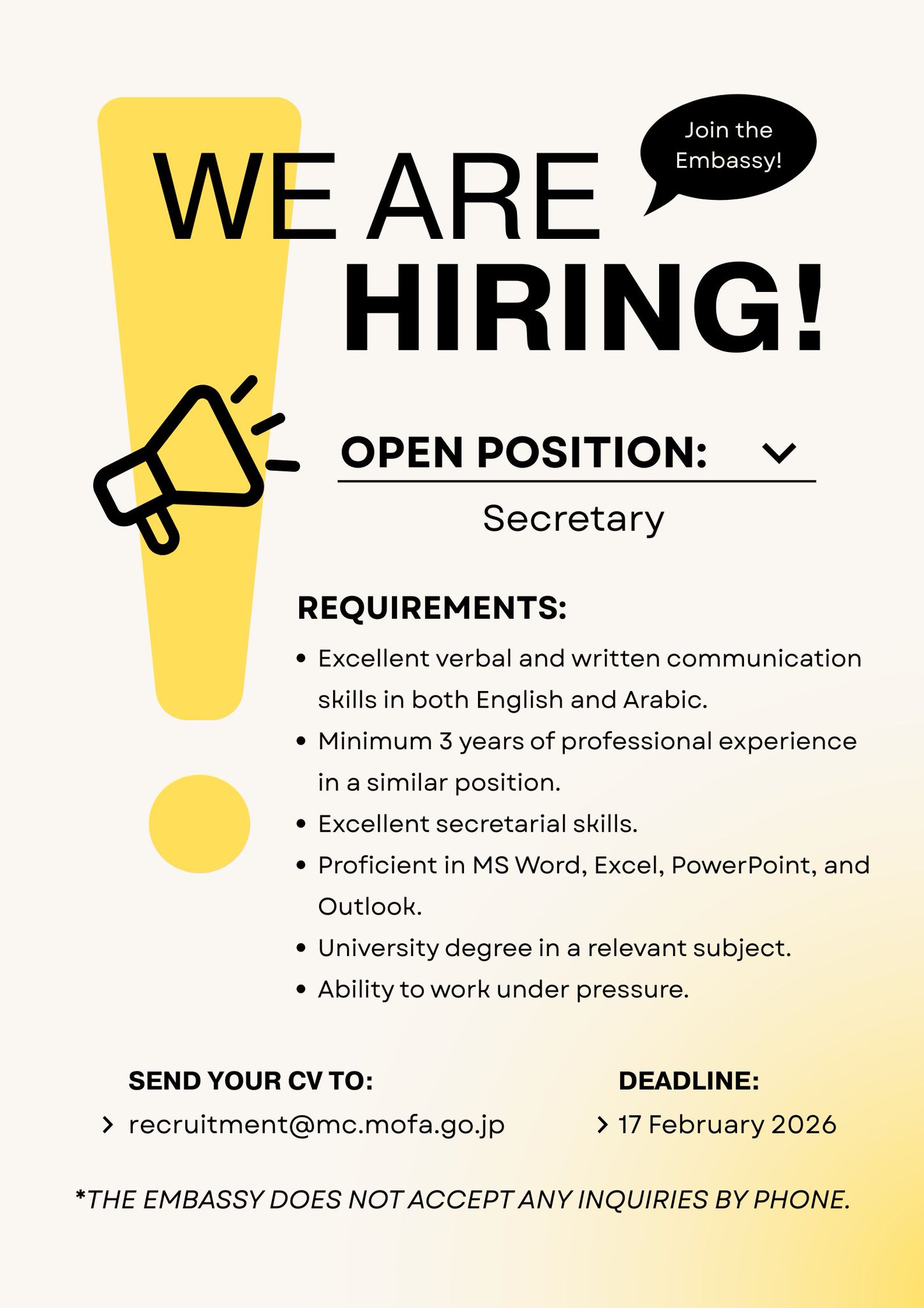 ارسل السيرة الذاتية على الايميل recruitment@mc.mofa.go.jp