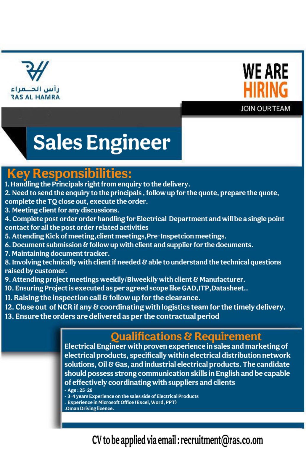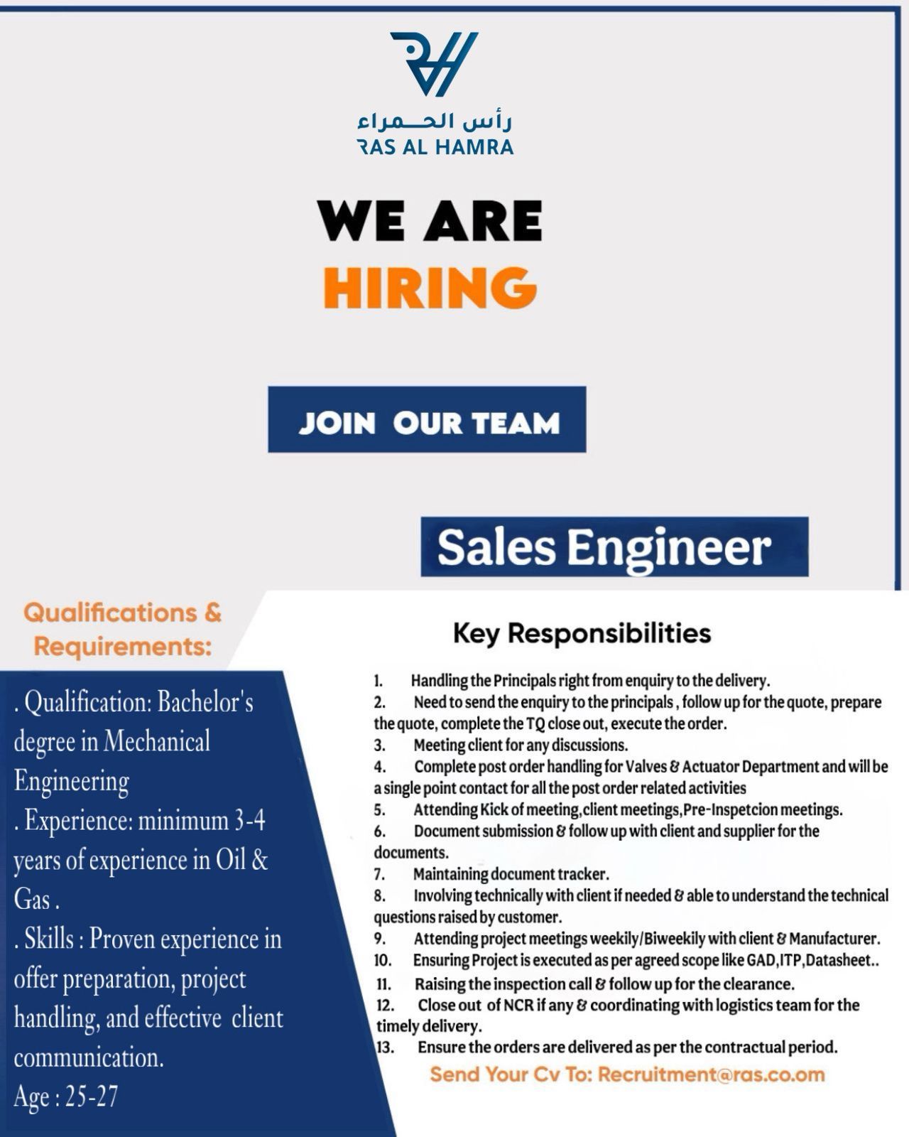 ارسل السيرة الذاتية على الايميل Recruitment@ras.co.om