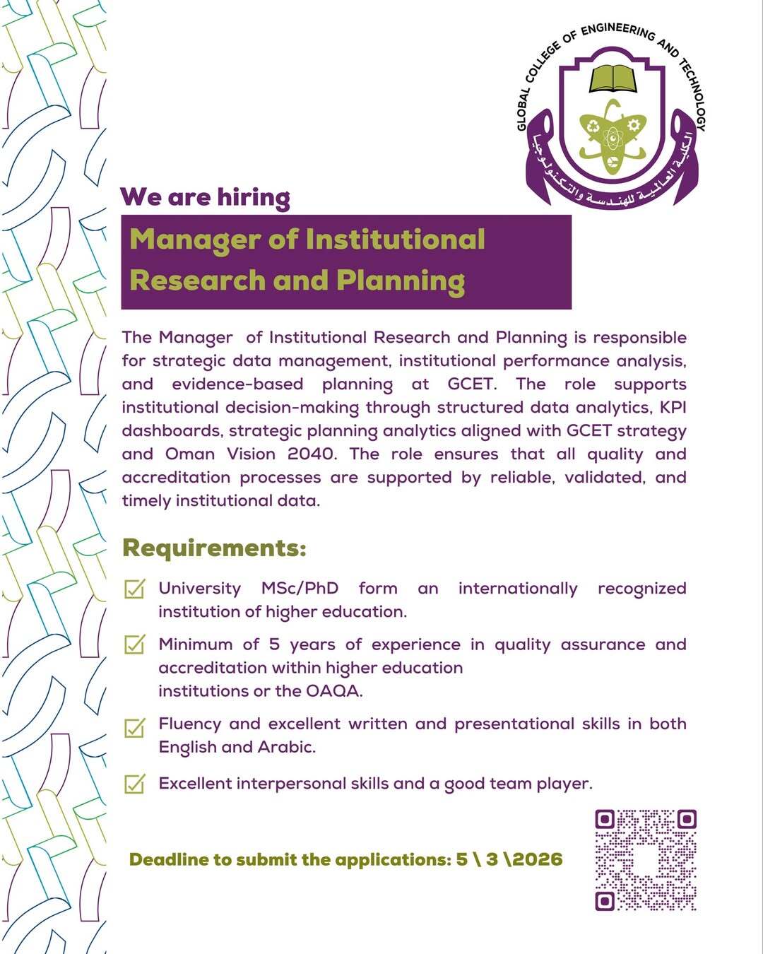 رابط التسجيل https://gcet.edu.om/en/job-vacancies/