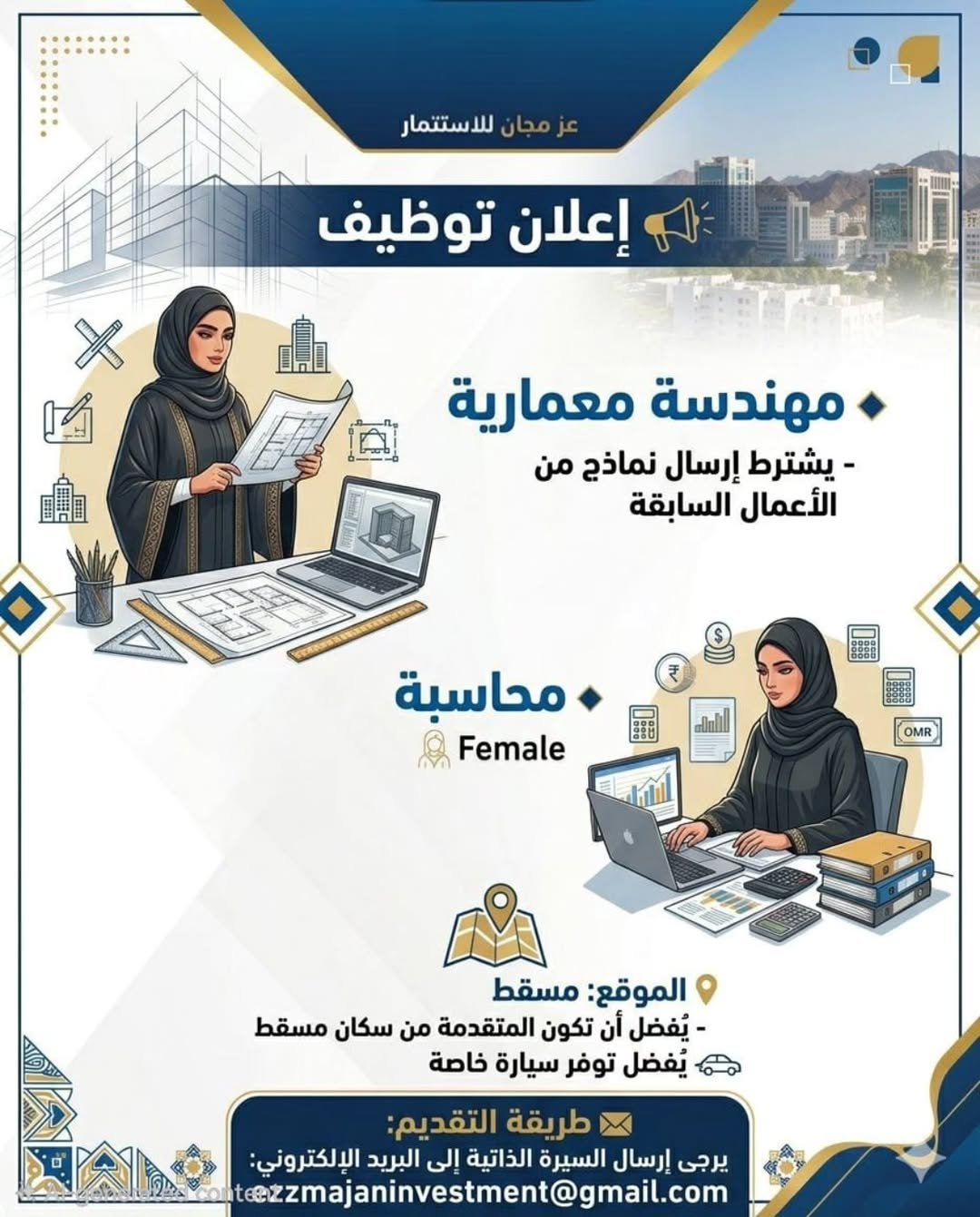 شركة عز مجان للاستتمار في مسقط - توفر وظيفتين شاغرتين ( محاسبة + مهندسة معمارية )