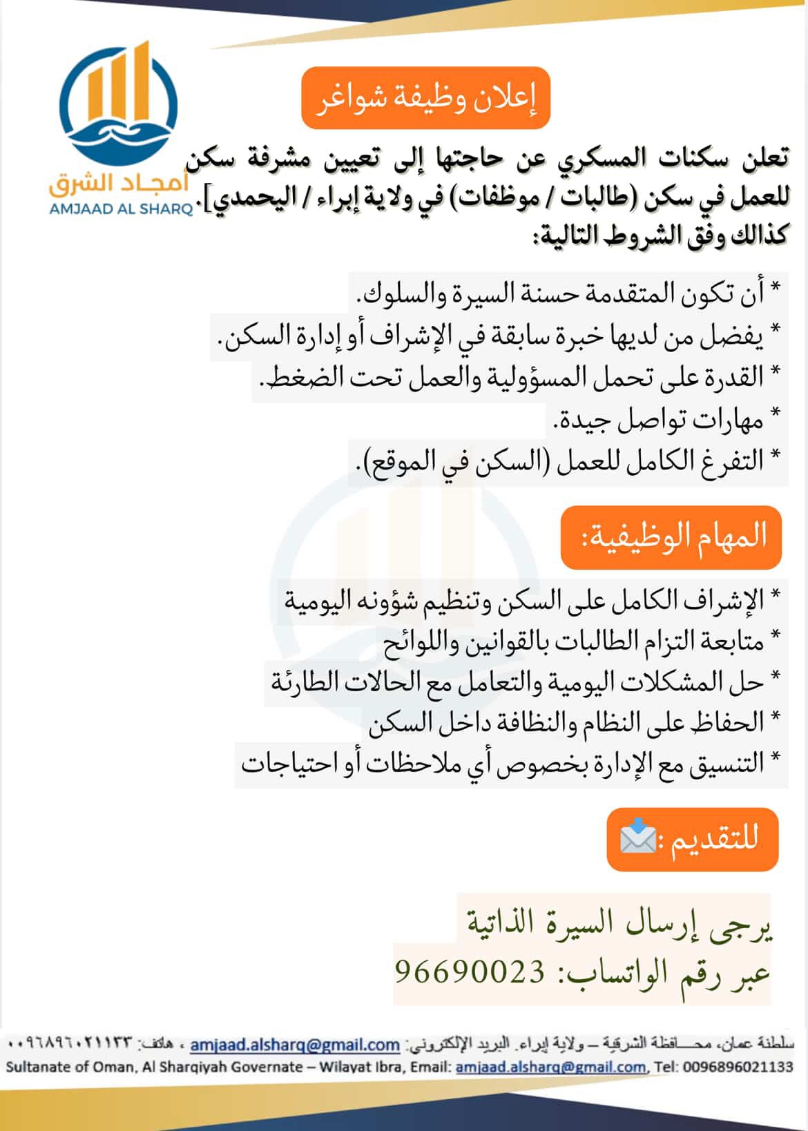 سكنات المسكري في ولاية إبراء - وظيفة شاغرة ( مشرفة سكن طالبات / موظفات )