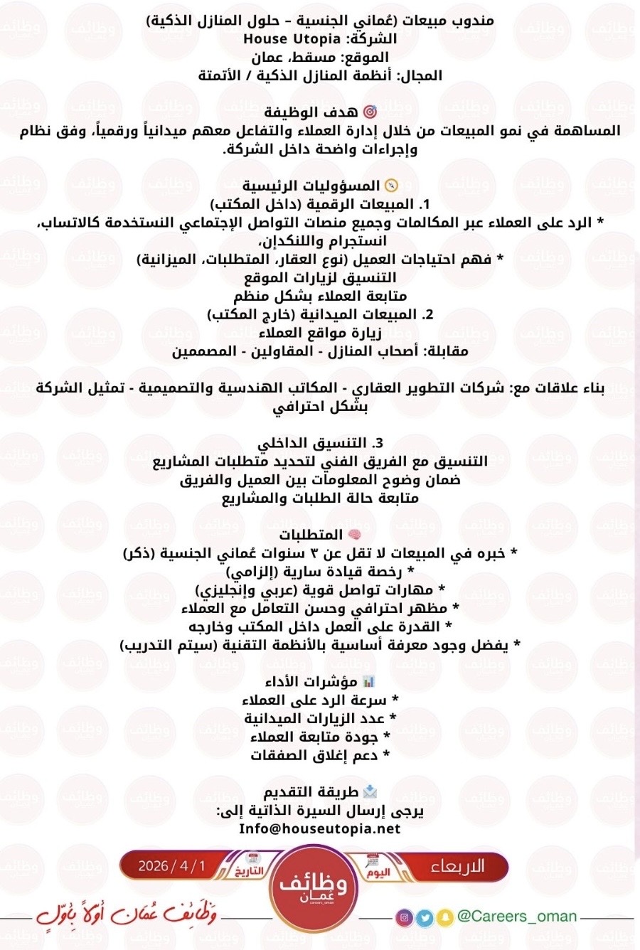 ارسل السيرة الذاتية على الايميل Info@houseutopia.net