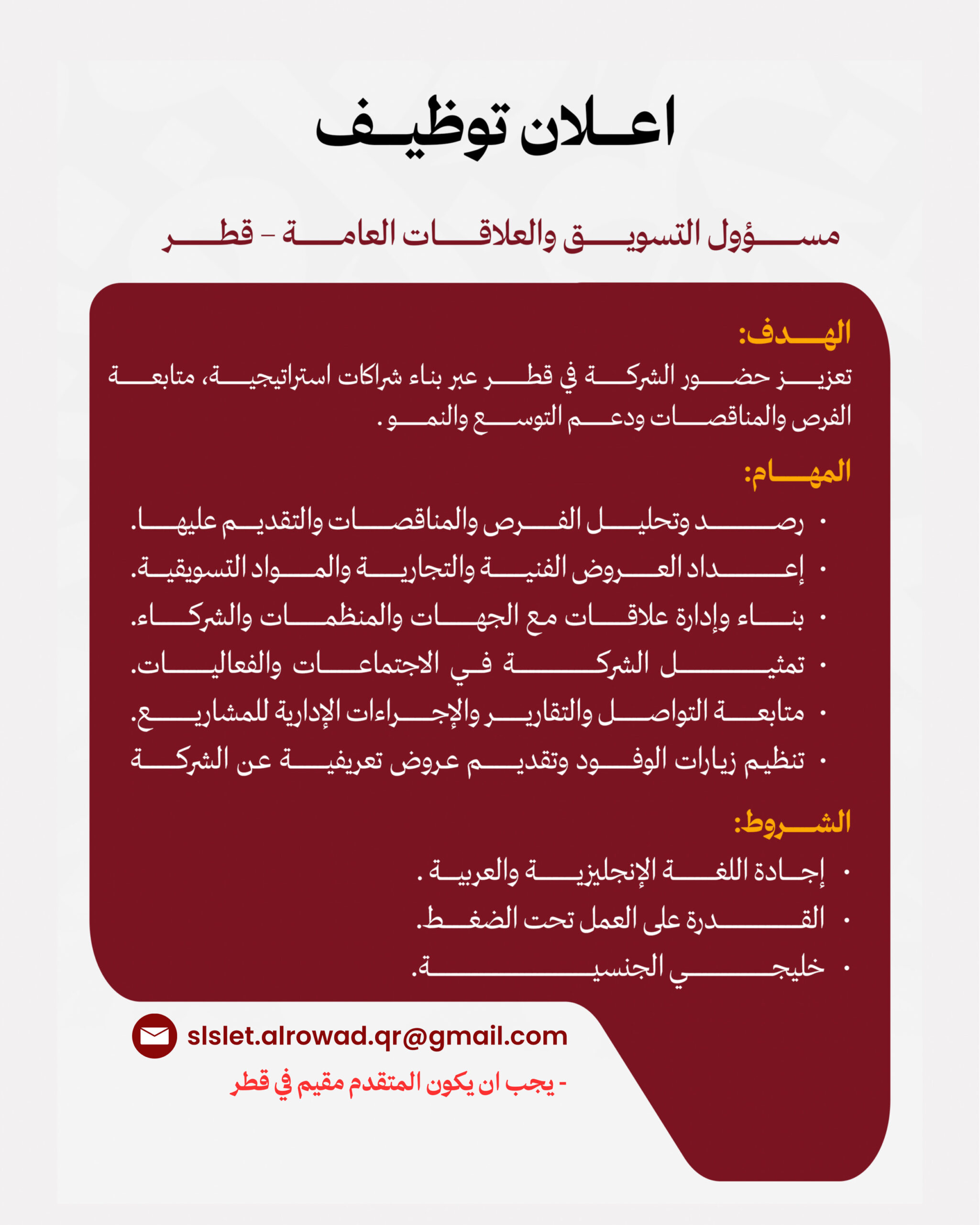 ارسل السيرة الذاتية على الايميل sislet.alrowad.qr@gmail.com