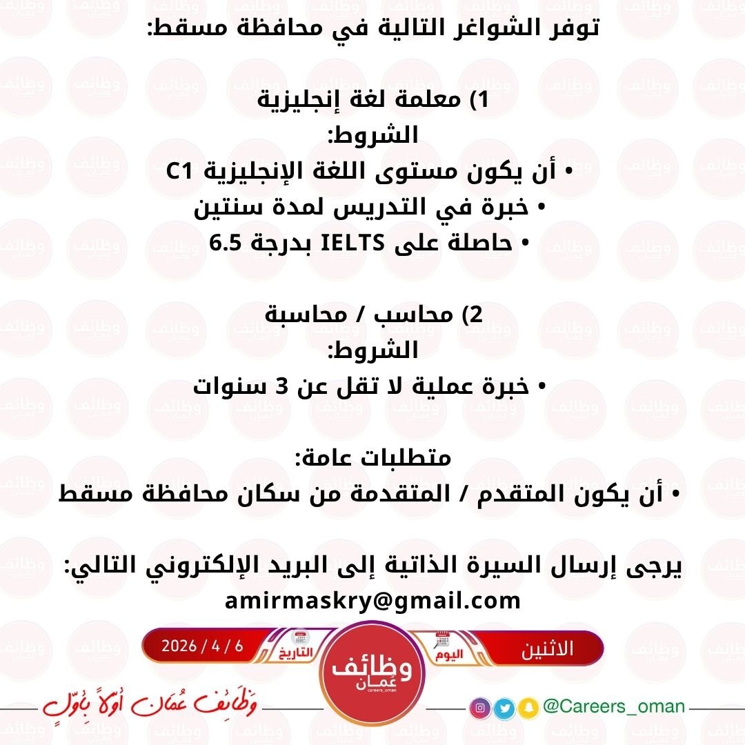معهد في السيب - توفر وظيفتين شاغرتين ( معلمة لغة انجليزية + محاسب/ة )