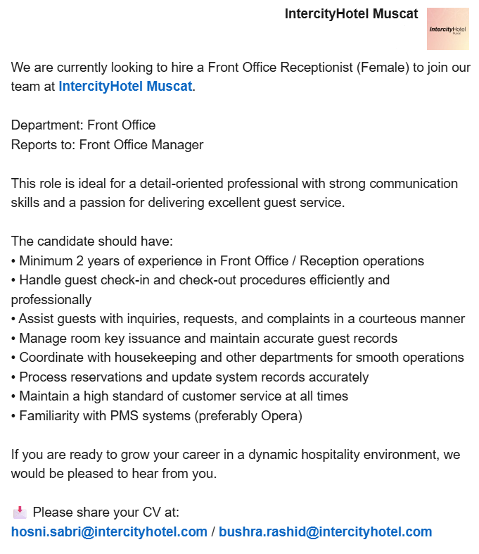 ارسل السيرة الذاتية على الايميل hosni.sabri@intercityhotel.com bushra.rashid@intercityhotel.c om