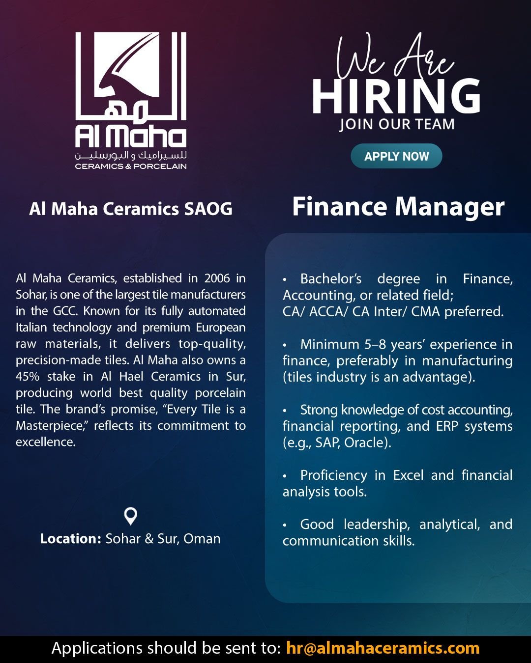 شركة المها للسيراميك والبورسلين في صحار وصور - وظيفة شاغرة ( Finance Manager )