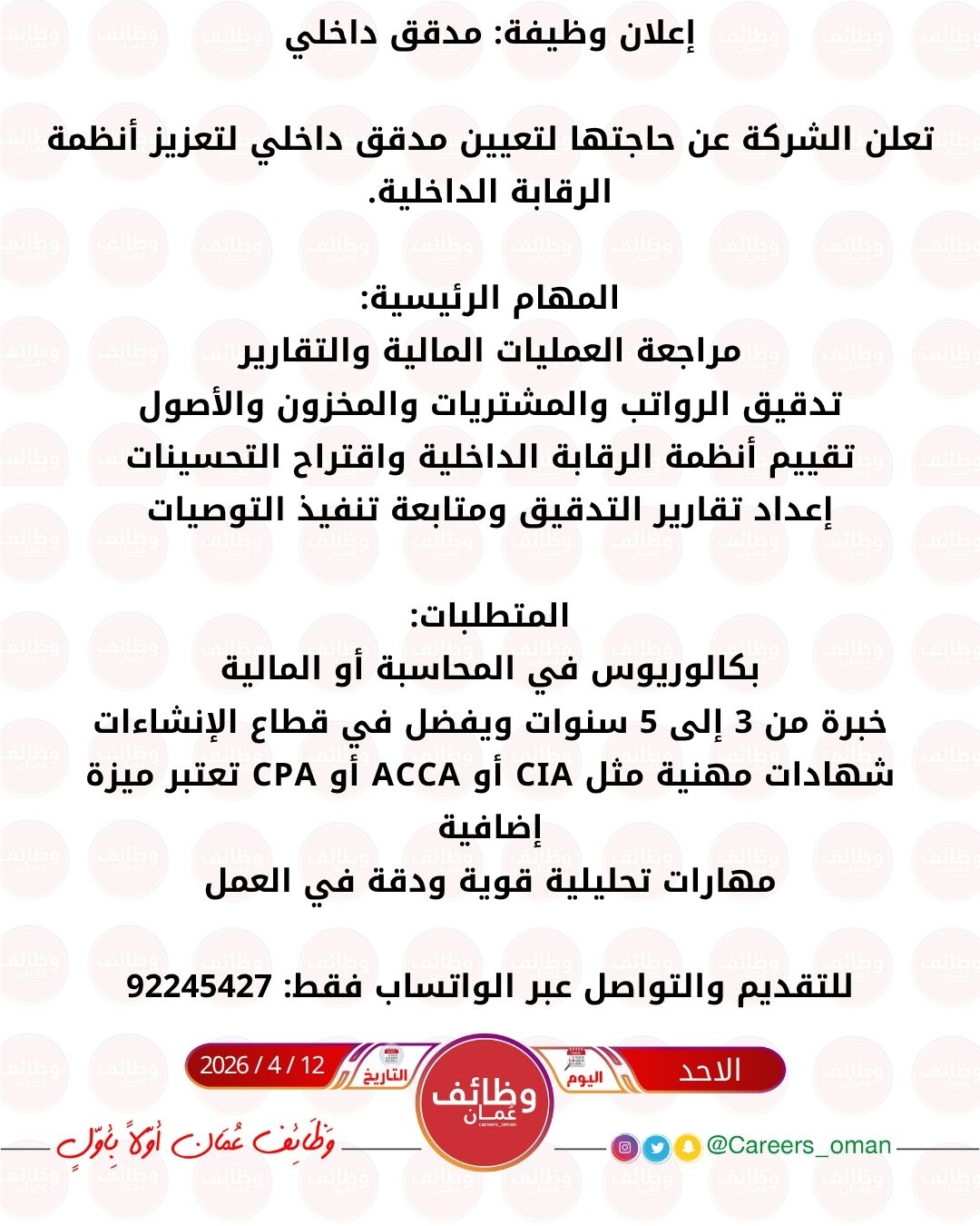 شركة رائدة في مسقط - وظيفة شاغرة ( مدقق داخلي )