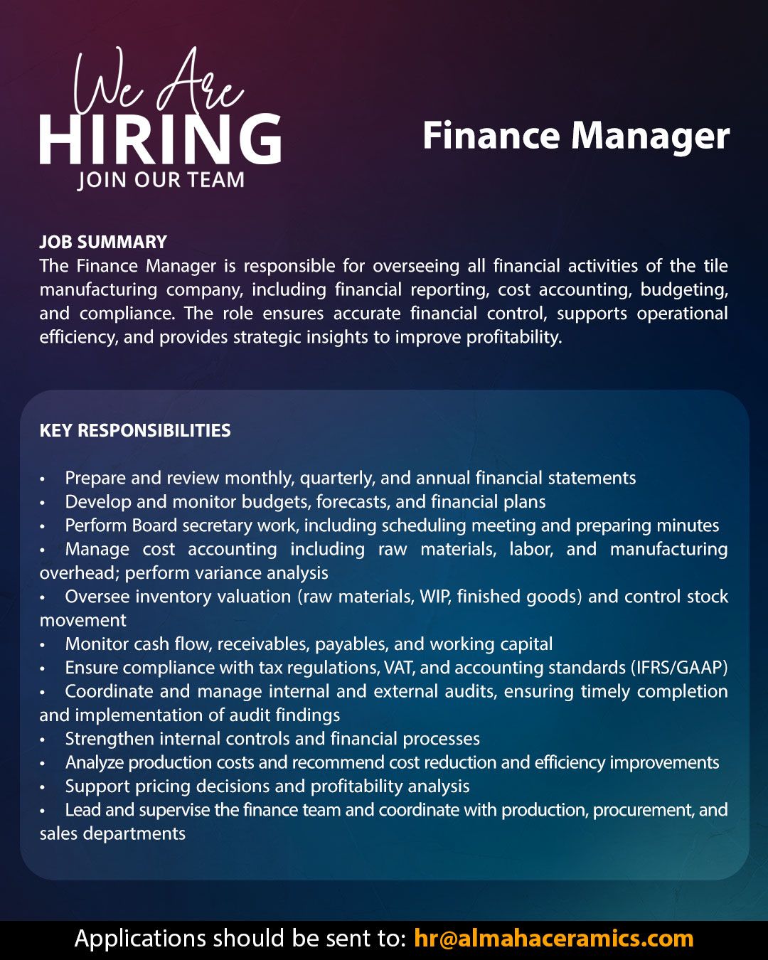 ارسل السيرة الذاتية على الايميل hr@almahaceramics.com